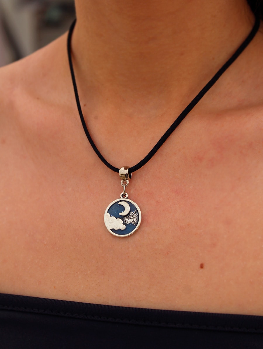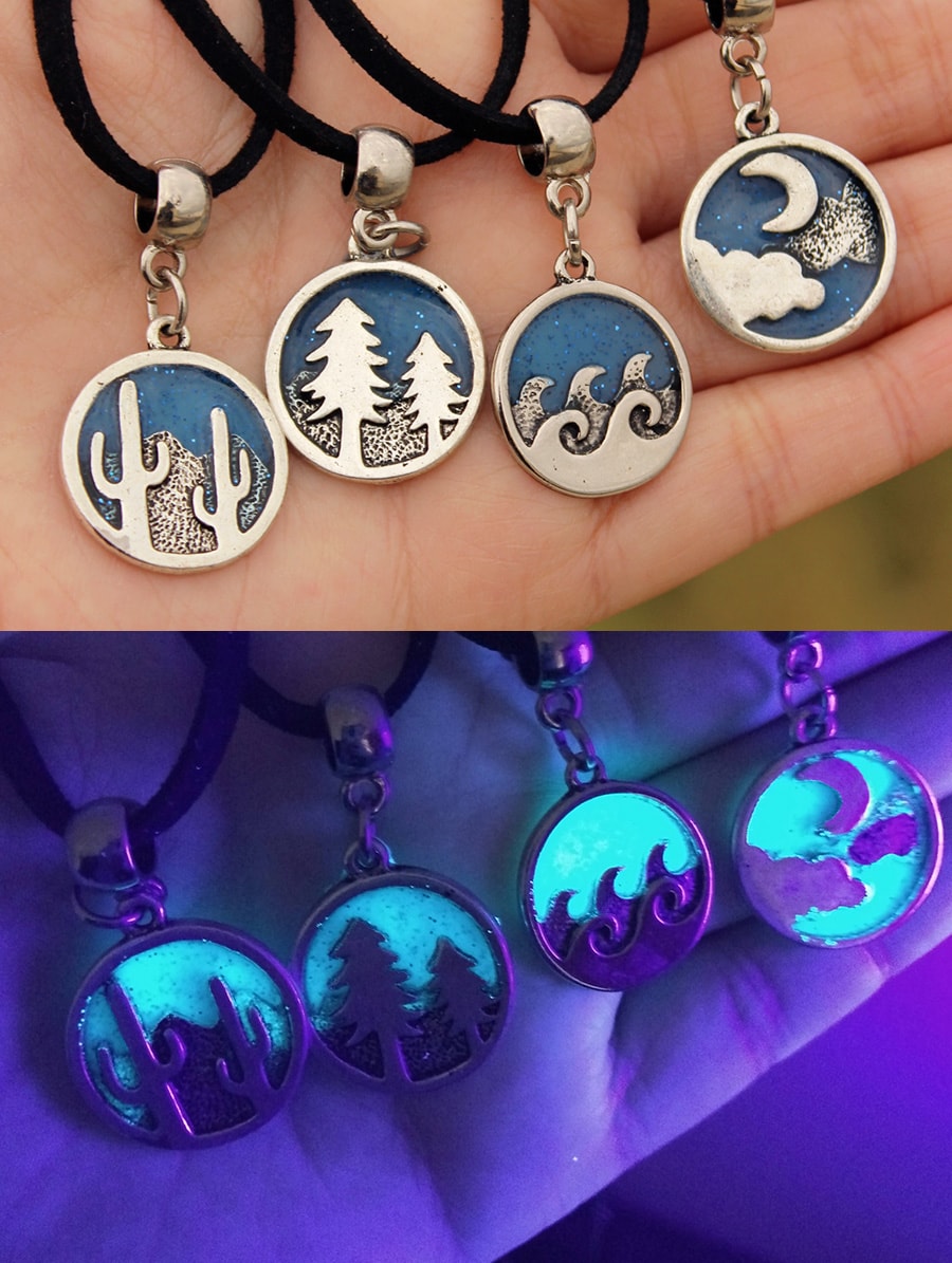 Material: Cordão de camurça e pingente fosforescente. Medida: 33cm de comprimento + 7cm de regulagem. Pingente de 2cm.