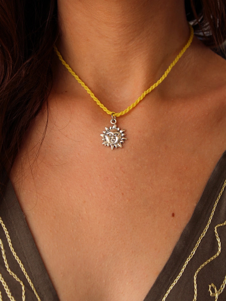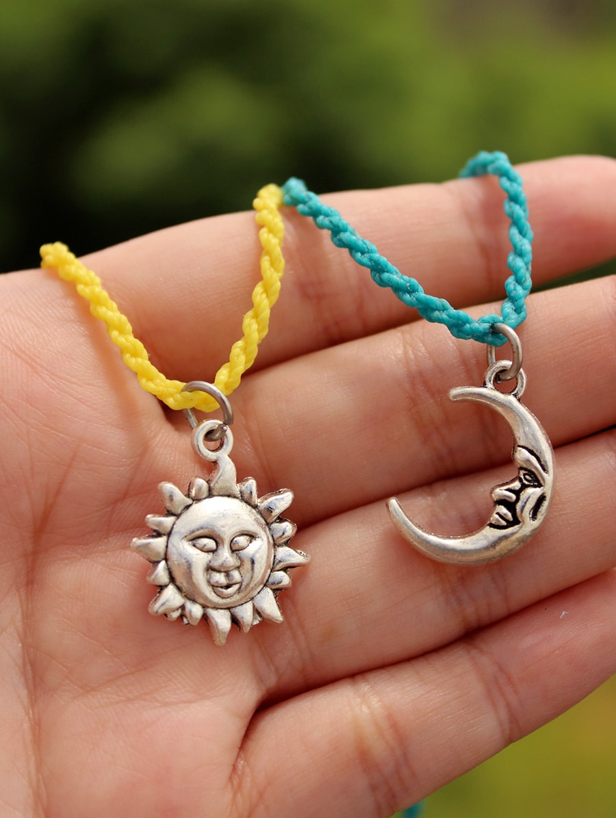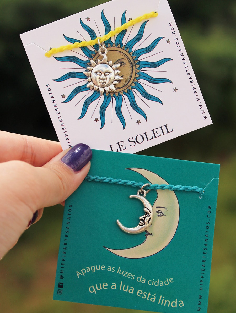 Gargantilha com pingente Sol ou Lua e cordão colorido.