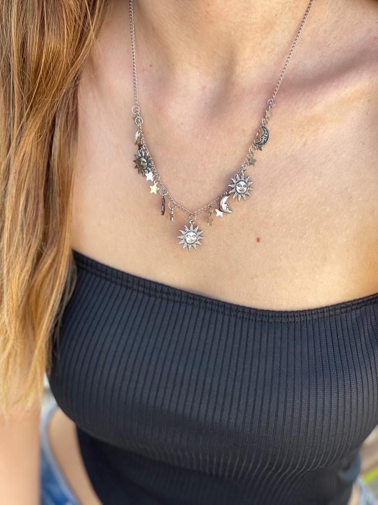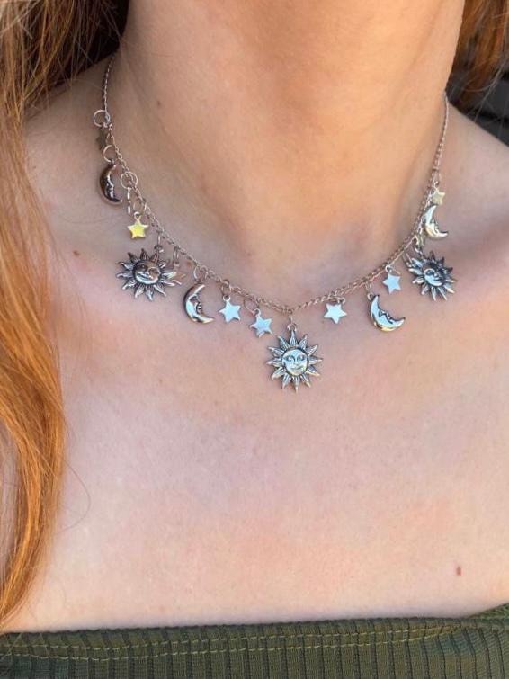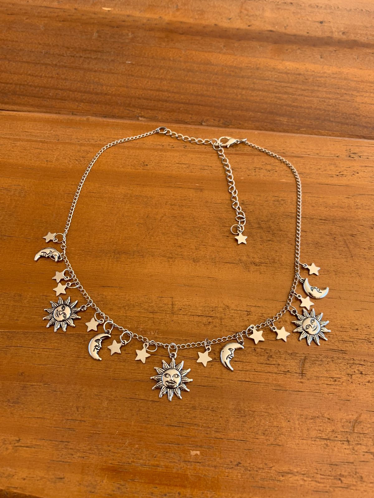 Gargantilha artesanal com pingentes Sol, Lua e Estrela.
