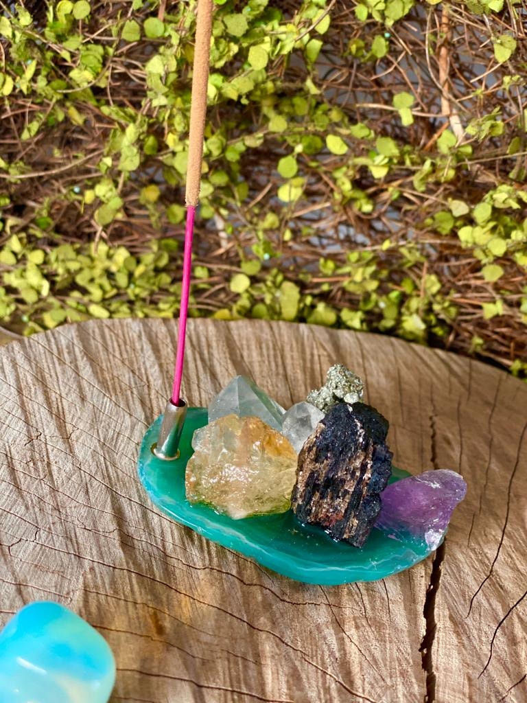 Incensário com base de ágata verde (cura) e as pedras ametista (espiritualidade e sabedoria), citrino (sucesso profissional), cristal (desfaz as negatividades), pirita (atrai dinheiro e prosperidade) e turmalina (contra as negatividades).