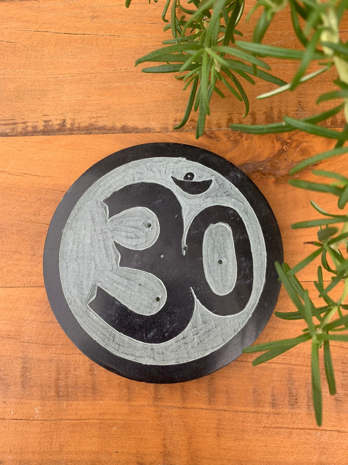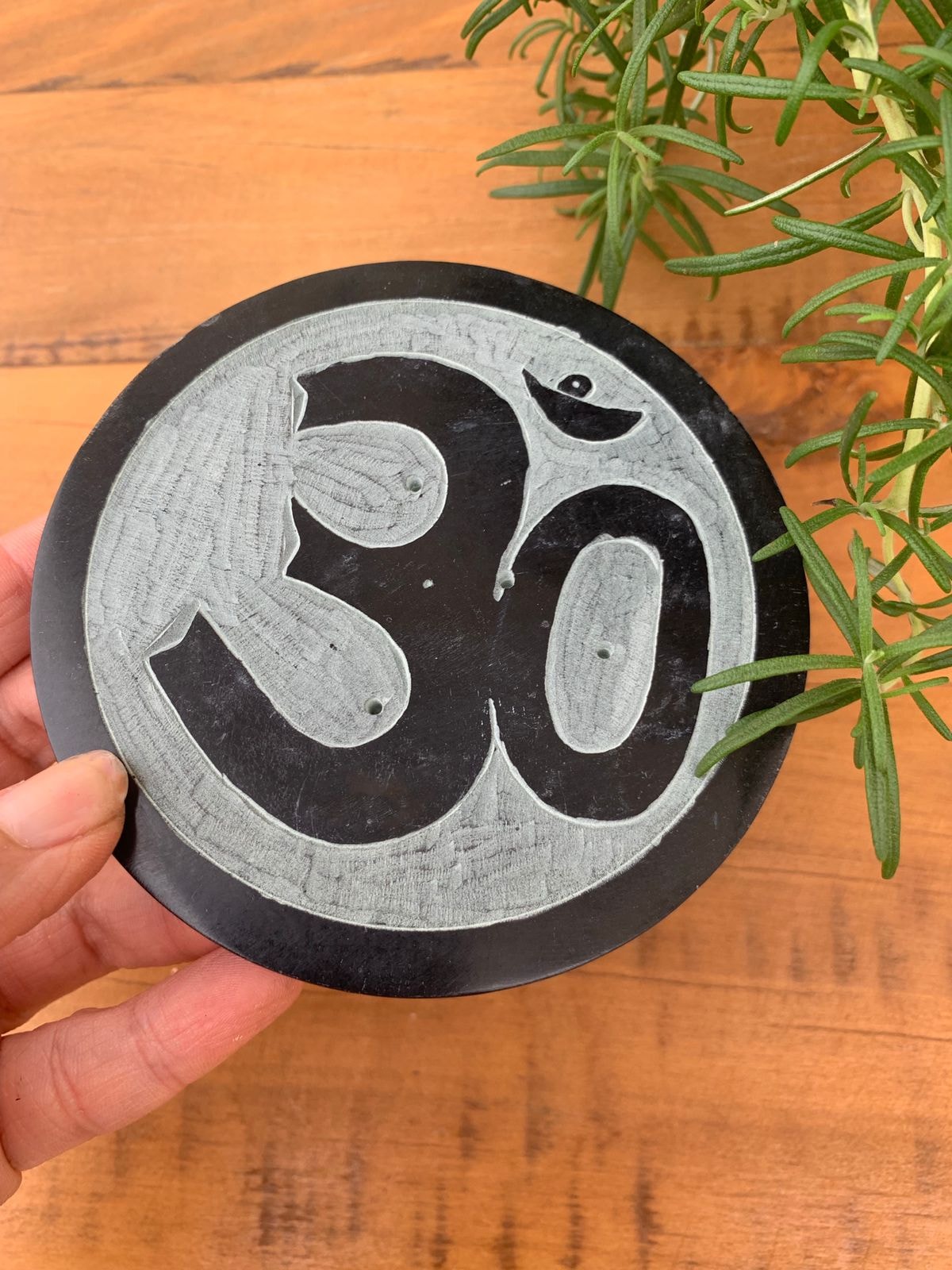 O Om é considerado o som do Universo, a substância essencial que constitui todos os mantras. Ele simboliza a raiz de todos os sons da natureza e do mundo, e a conexão com essa sintonia de criação. O símbolo é a representação da fonte de todas as manifestações, a pulsação criativa que engendra os mundos. Om é o mundo inteiro. O passado, o presente, o futuro. A pedra sabão é historicamente utilizada por diversas tribos das Américas faziam uso do material para produzir artigos que eram utilizados em seus rituais de purificação, como cachimbos e recipientes para a queima de ervas.