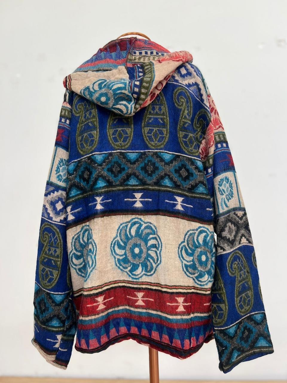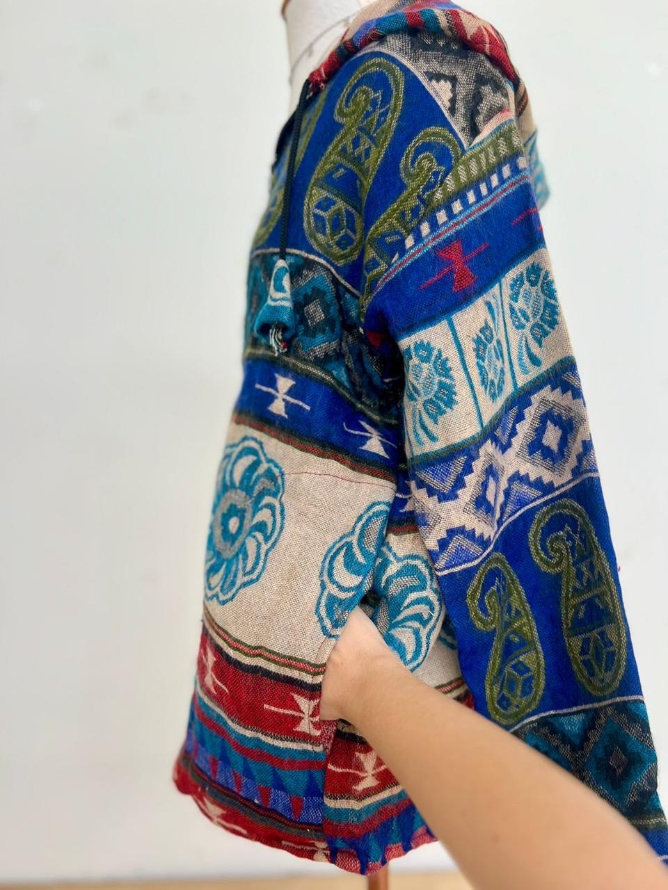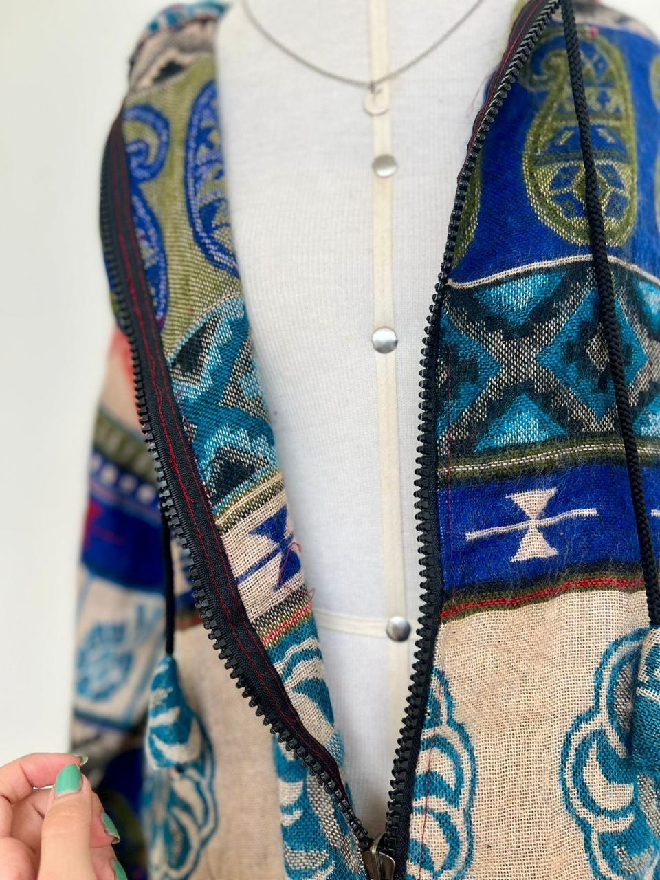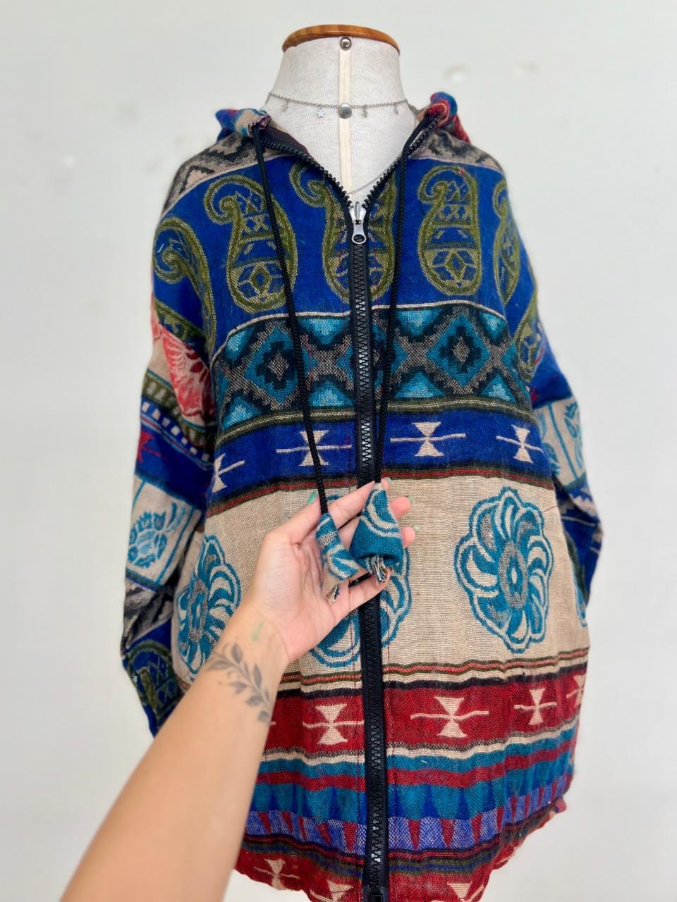 Jaqueta unissex. Com zíper, capuz e dois bolsos com tecido aveludado.
