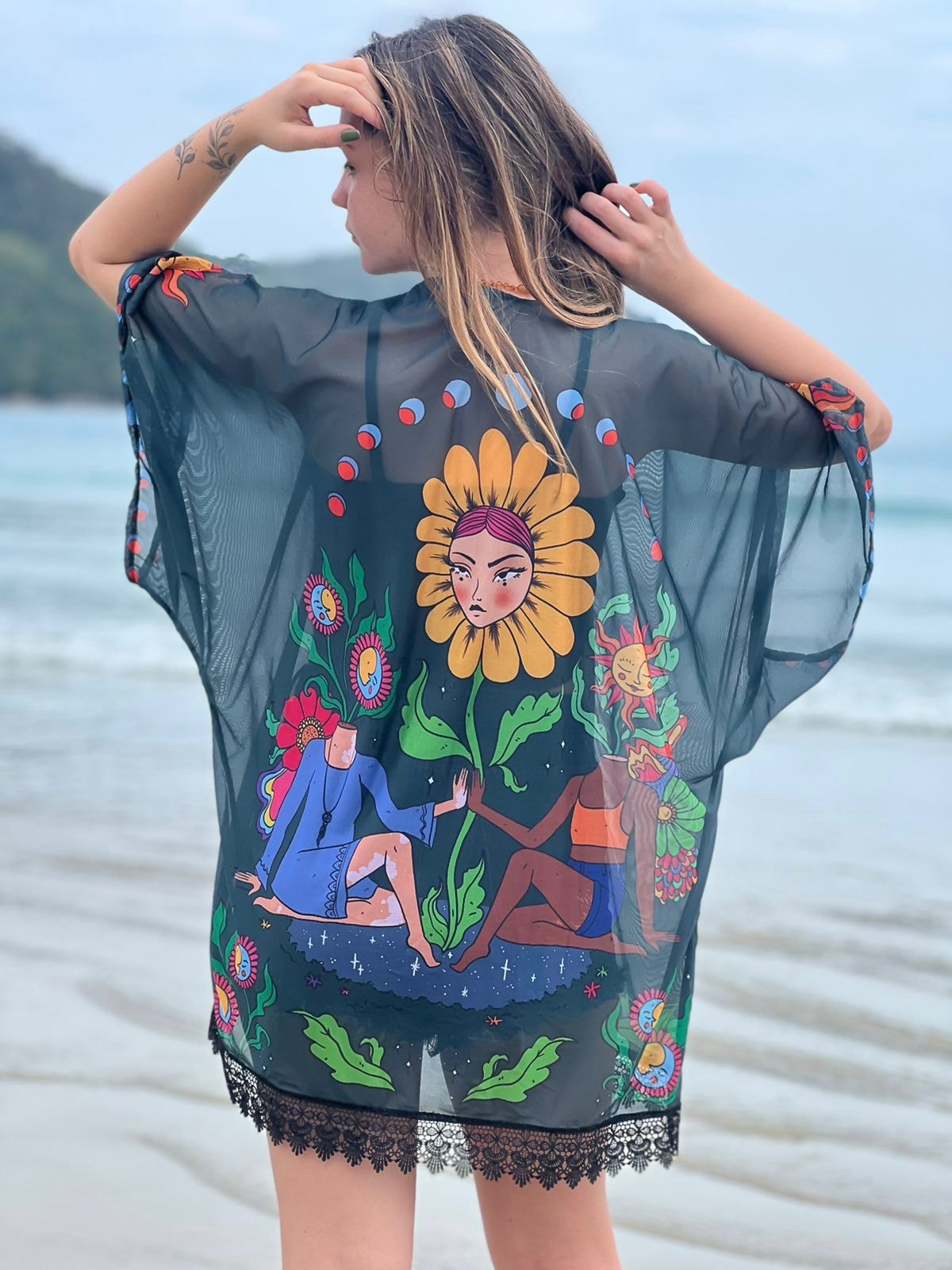 Estampada com dois corpos femininos em meio a elementos naturais, o kimono Irmandade Sol e Lua remete à força sagrada das mulheres, à sabedoria ancestral e aos ciclos naturais das flores, do sol e da lua.