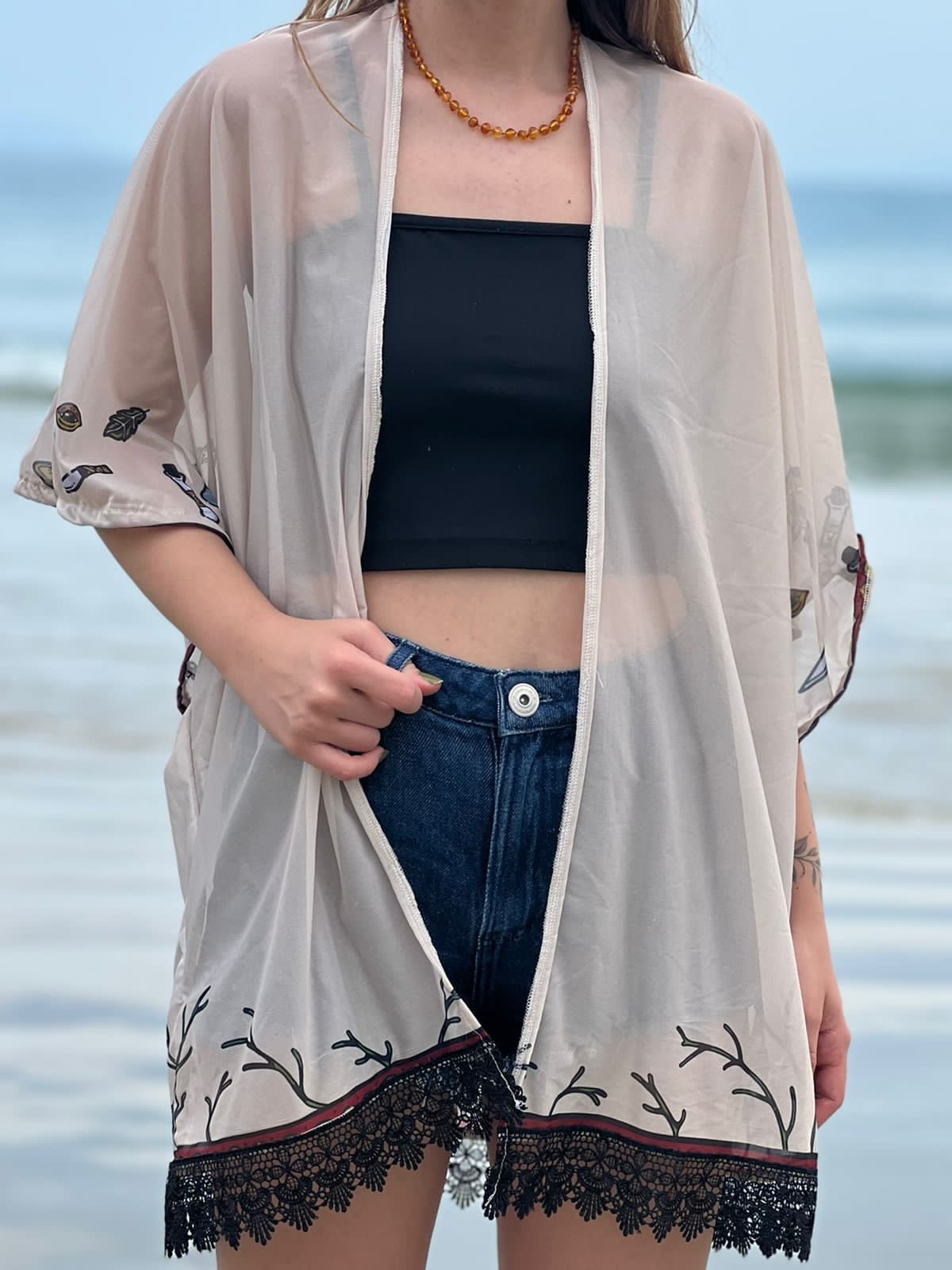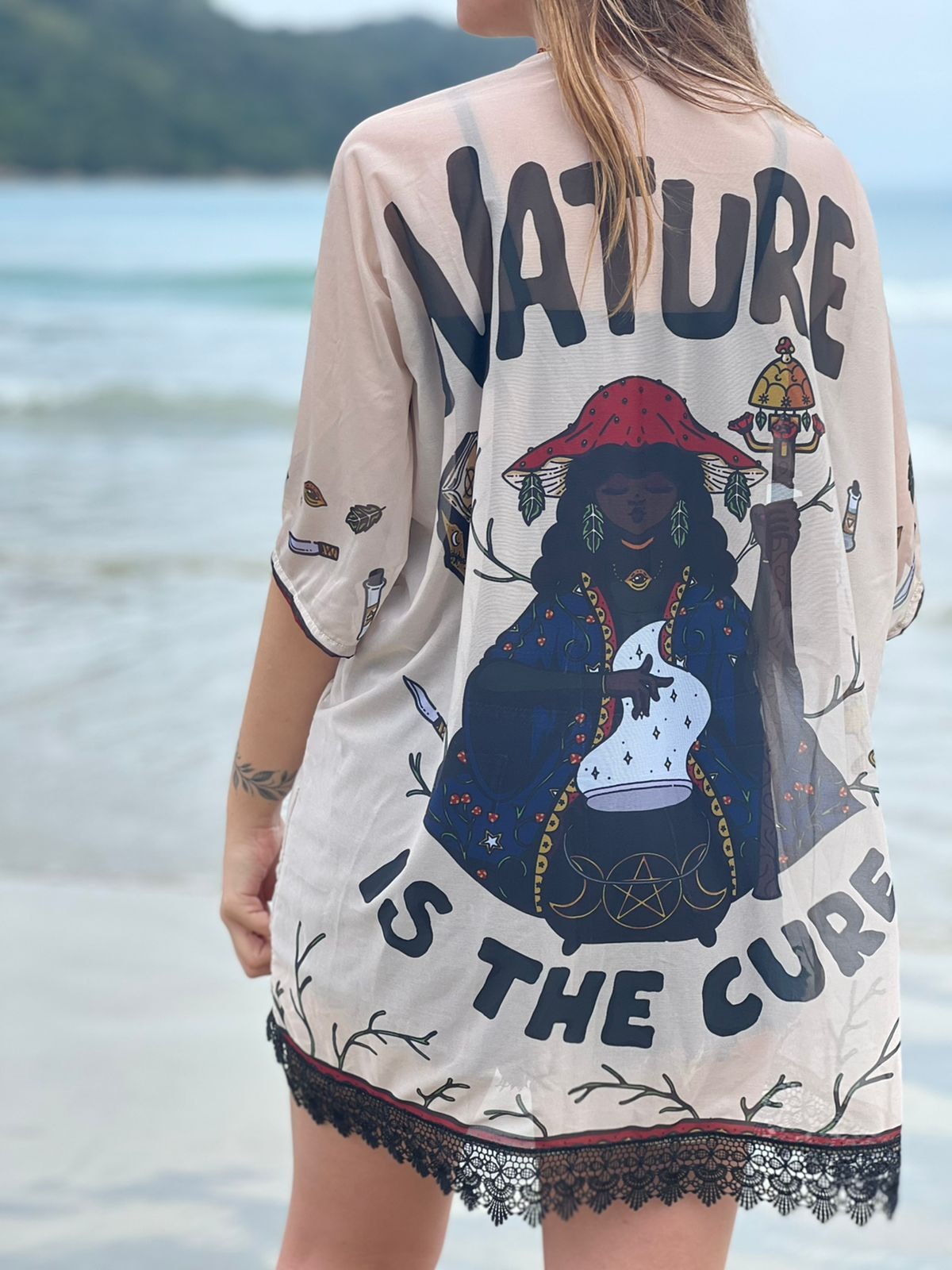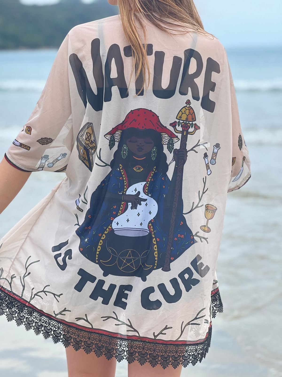 O kimono Nature Is The Cure traz em sua estampa a imagem de uma bruxa fazendo magia com os encantos da natureza.