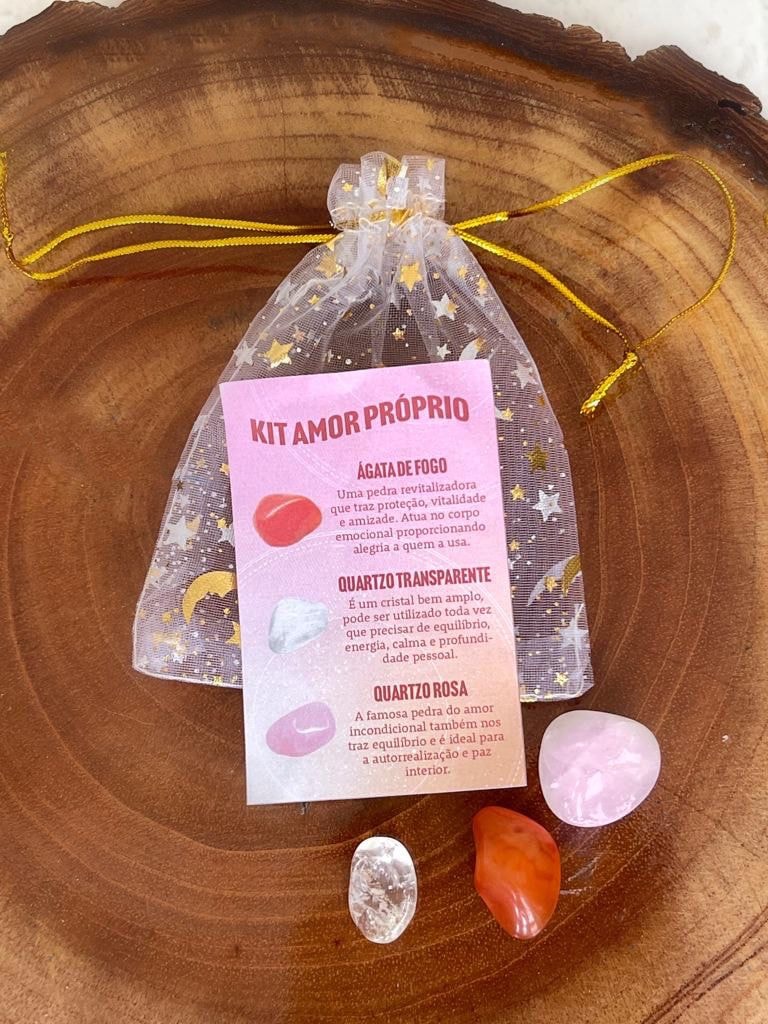 A Ágata de fogo é uma pedra com o poder de atrair vitalidade e força, que pode ser física e psíquica. É conhecida como a Pedra da Disposição. O Cristal é usado como ferramenta de cura. Amplifica a energia e o pensamento. O quartzo transparente equilibra e revitaliza os planos físico, mental, emocional e espiritual. O Quartzo Rosa é conhecido como a Pedra do Amor, pois estimula nossa capacidade de amar, tanto a nós quanto a outros, ajudando nas relações afetivas e na autoestima. É indicada para quem tem medo de demonstrar suas emoções.
