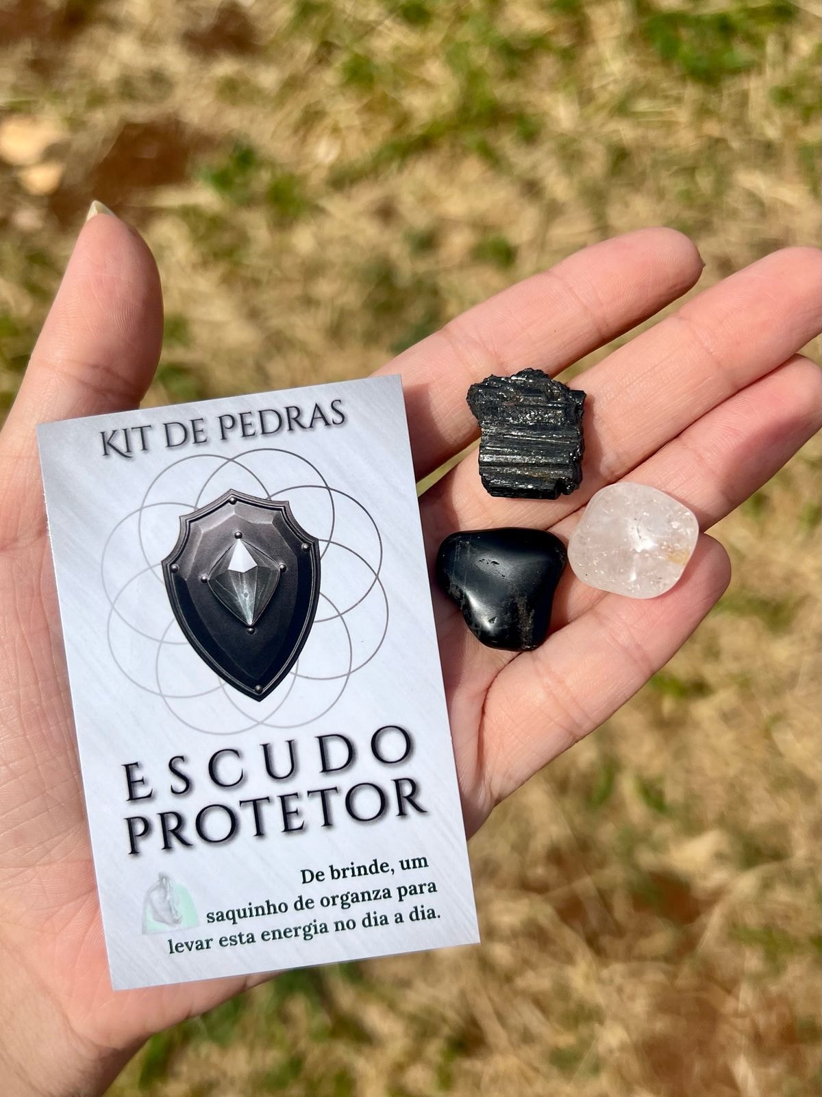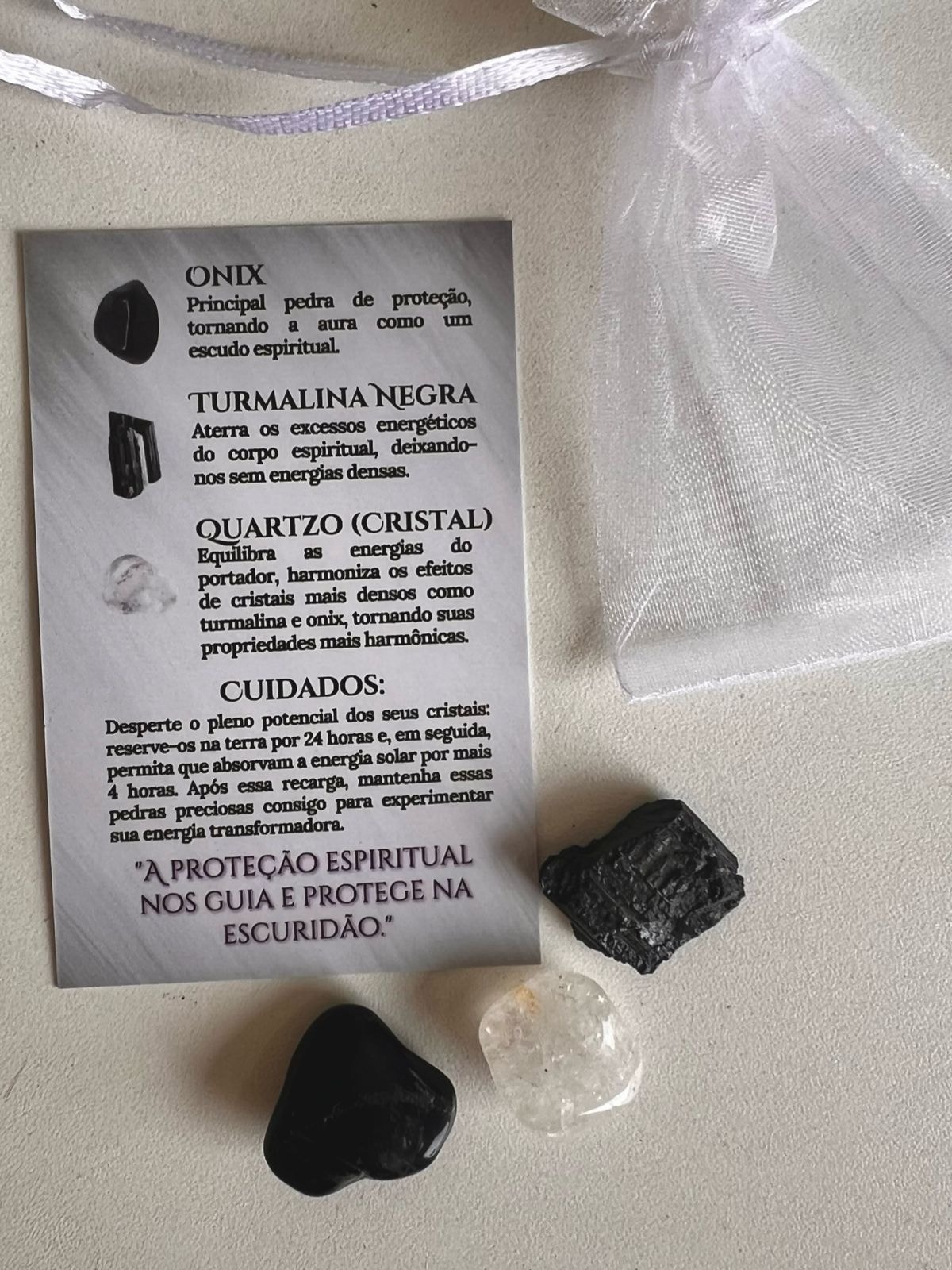 Kit com Ônix (proteção), Cristal (harmoniza e purifica energias) e Turmalina negra (descarrega energias acumuladas).