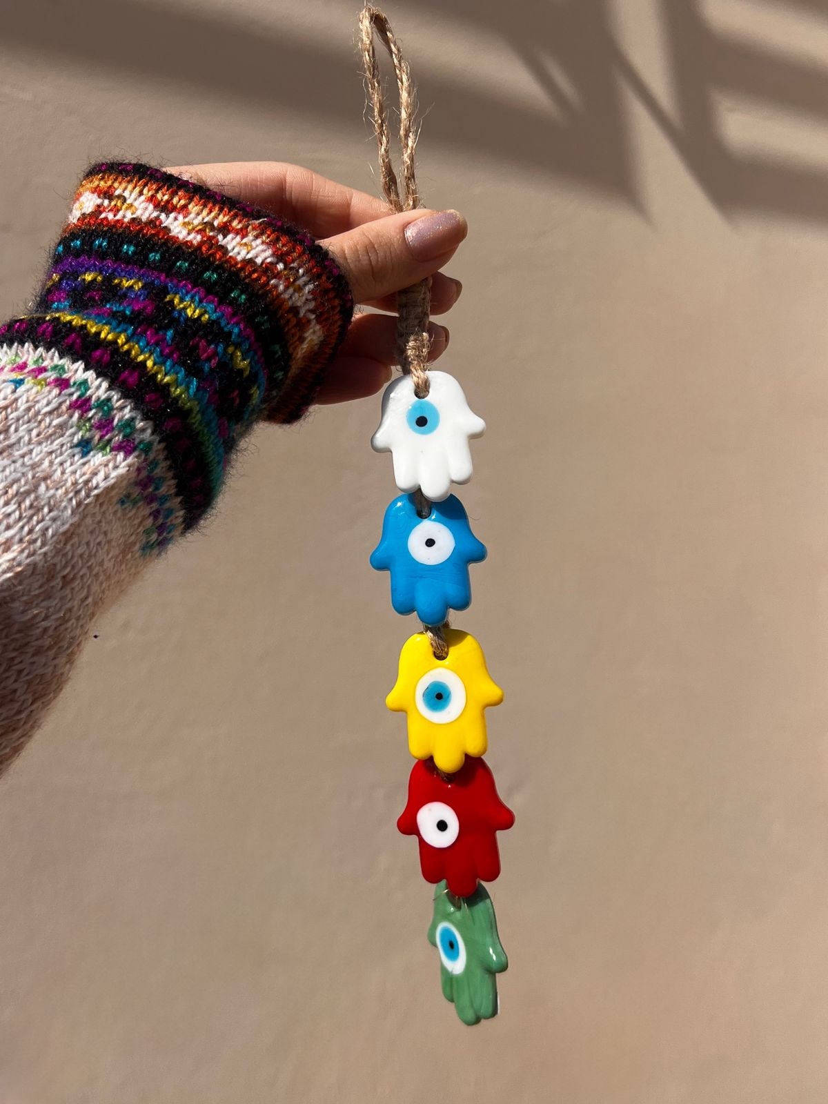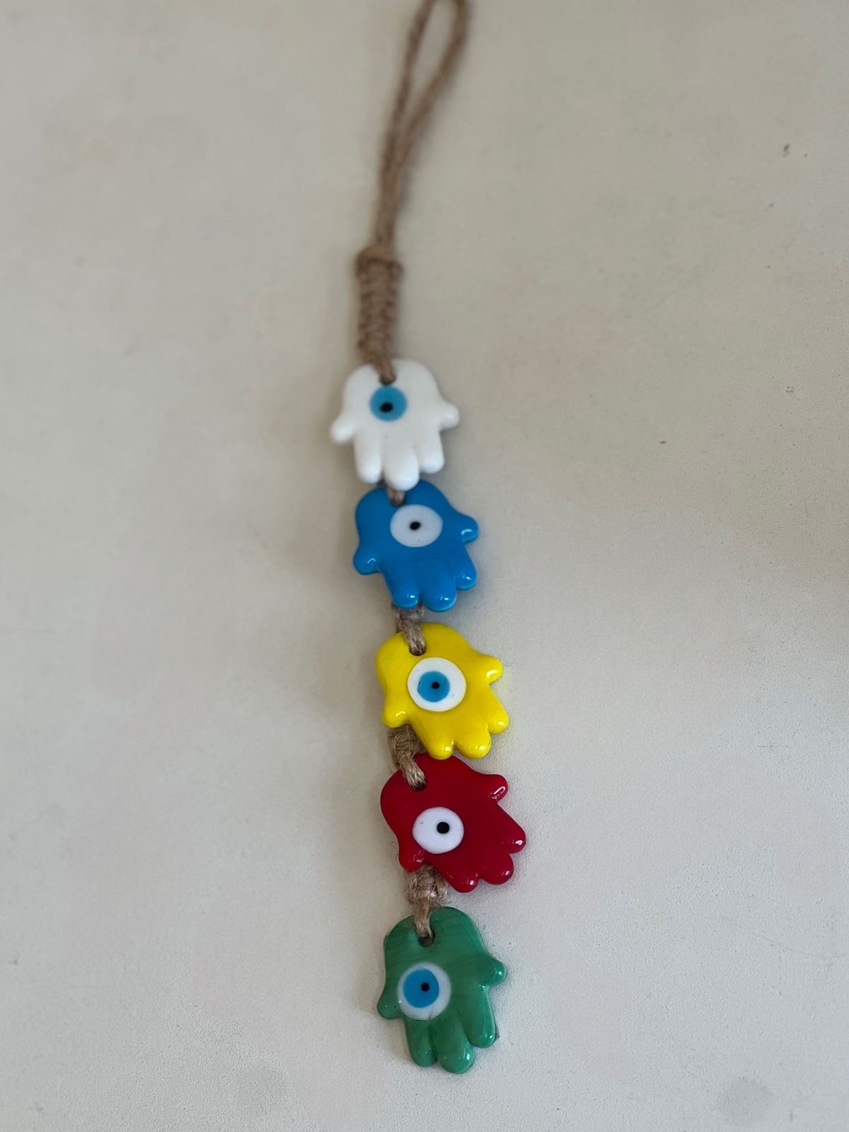 Trança de sisal, hamsas de Murano (lembra vidro)