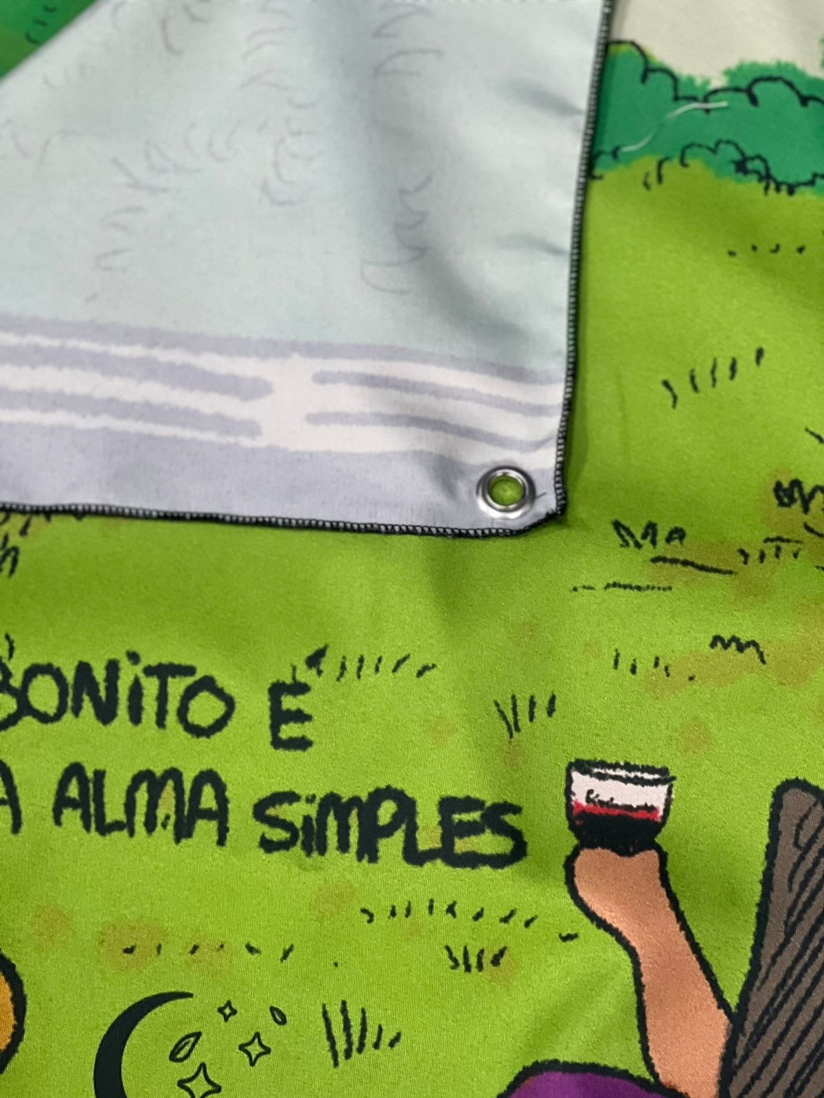 * Possui ilhós (círculo de metal para pendurar).