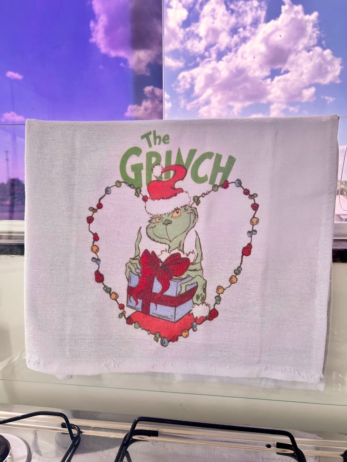 O pano de prato Grinch é uma homenagem a esse personagem icônico que jura ser inimigo da alegria natalina, mas descobre que, no fundo, tem sim um grande coração <3