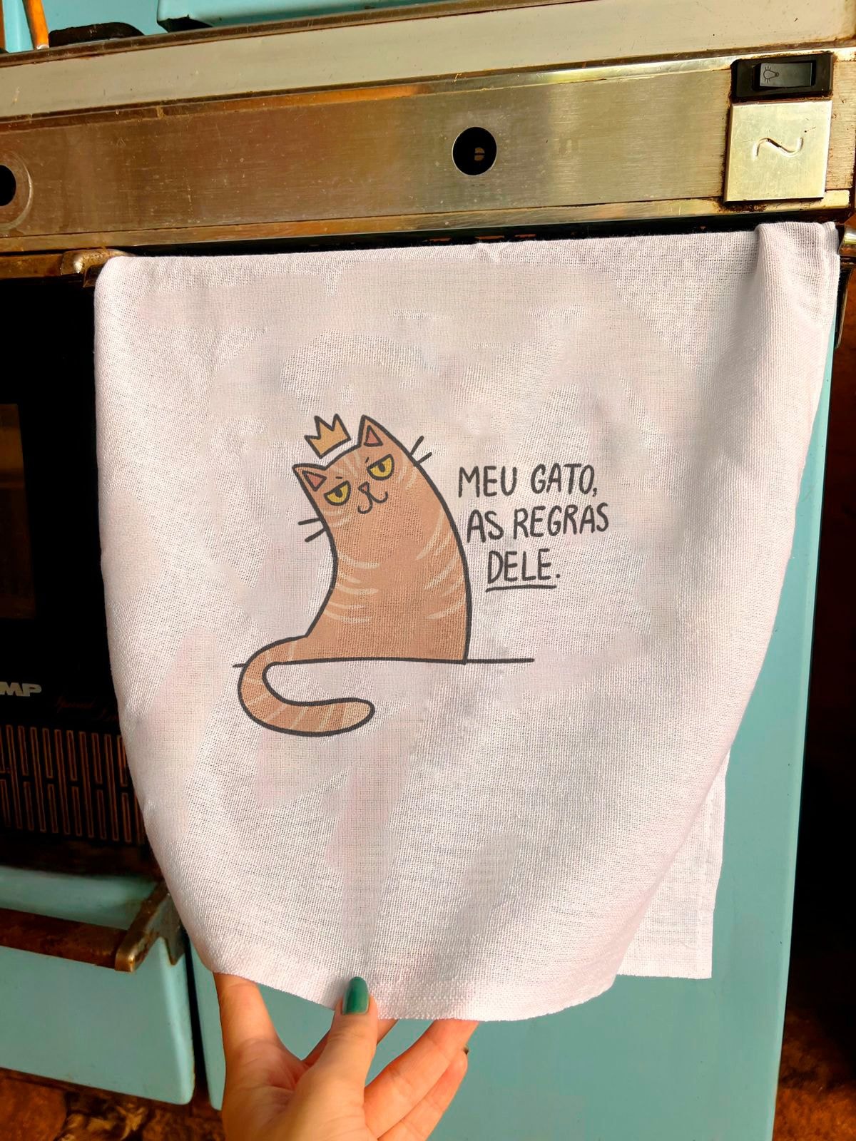 E o pano de prato 'Meu Gato, as Regras Dele' é o toque final para deixar claro para os convidados quem realmente manda no espaço.