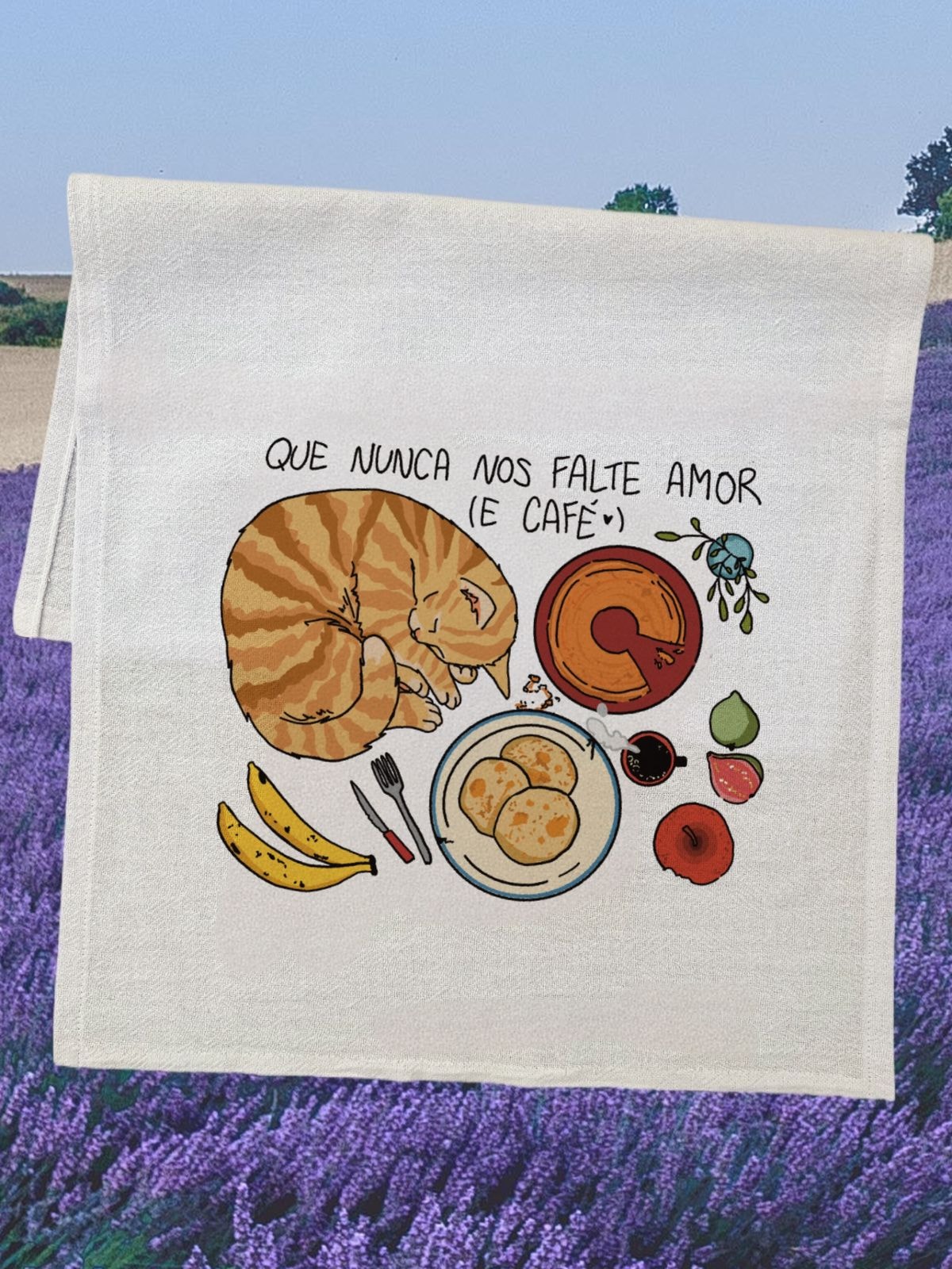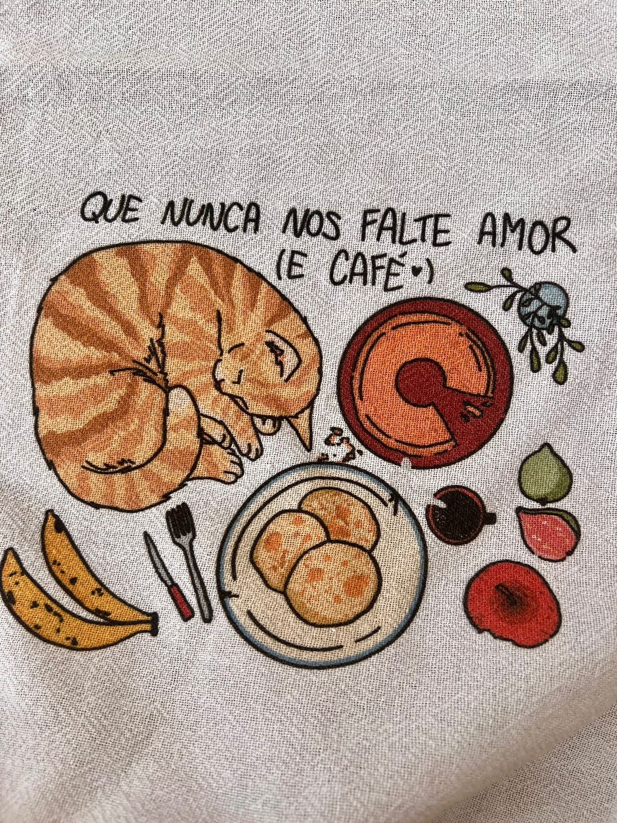 O pano de prato 'Que nunca nos falte' é como uma oração, pedindo que sua casa tenha sempre café fresquinho e uma cadeira reservada para boas companhias.