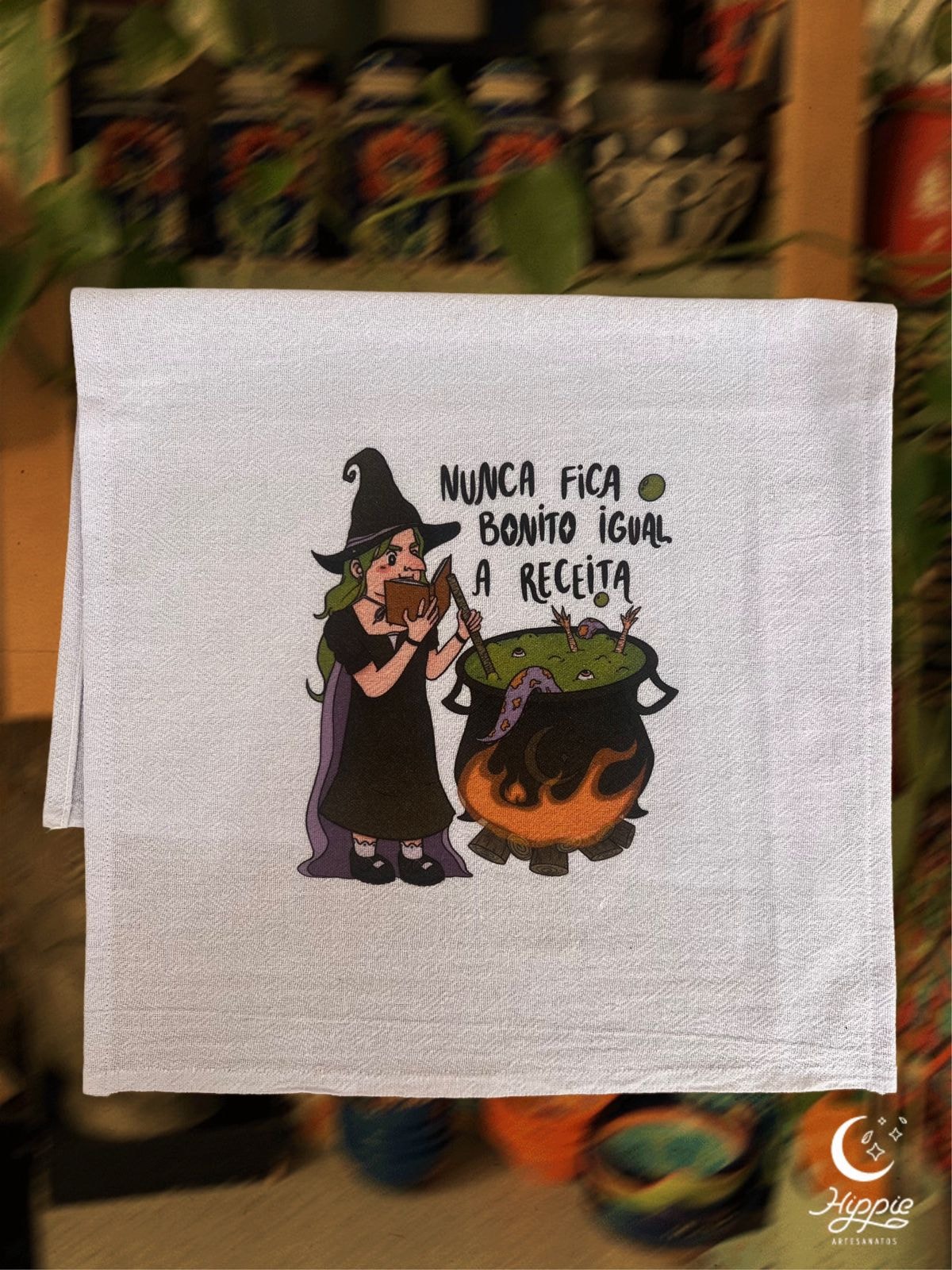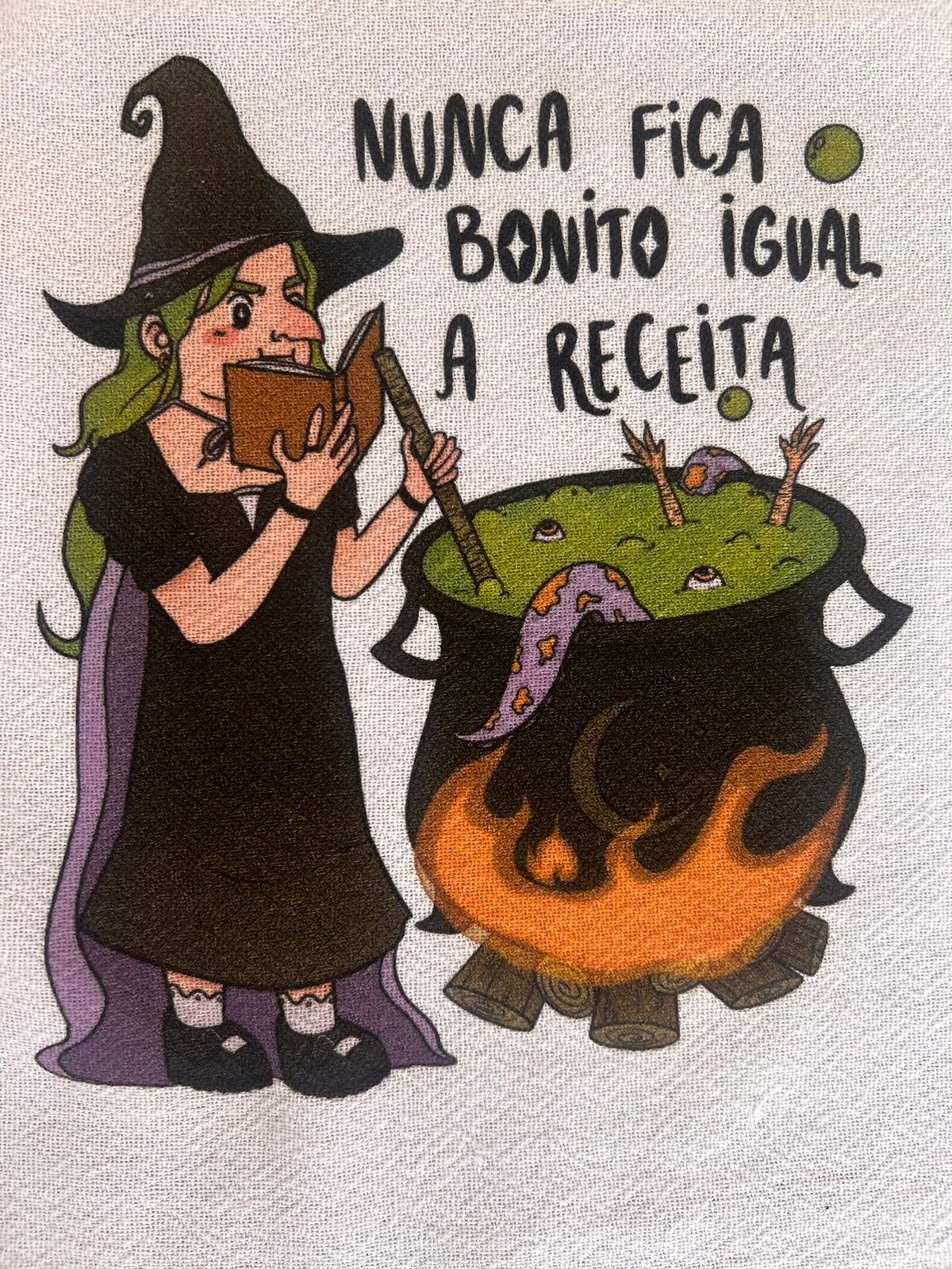 O pano de prato Receita representa as bruxas que reproduzem cada passo da receita, com tudo na medida, e não chegam nem perto do esperado.
