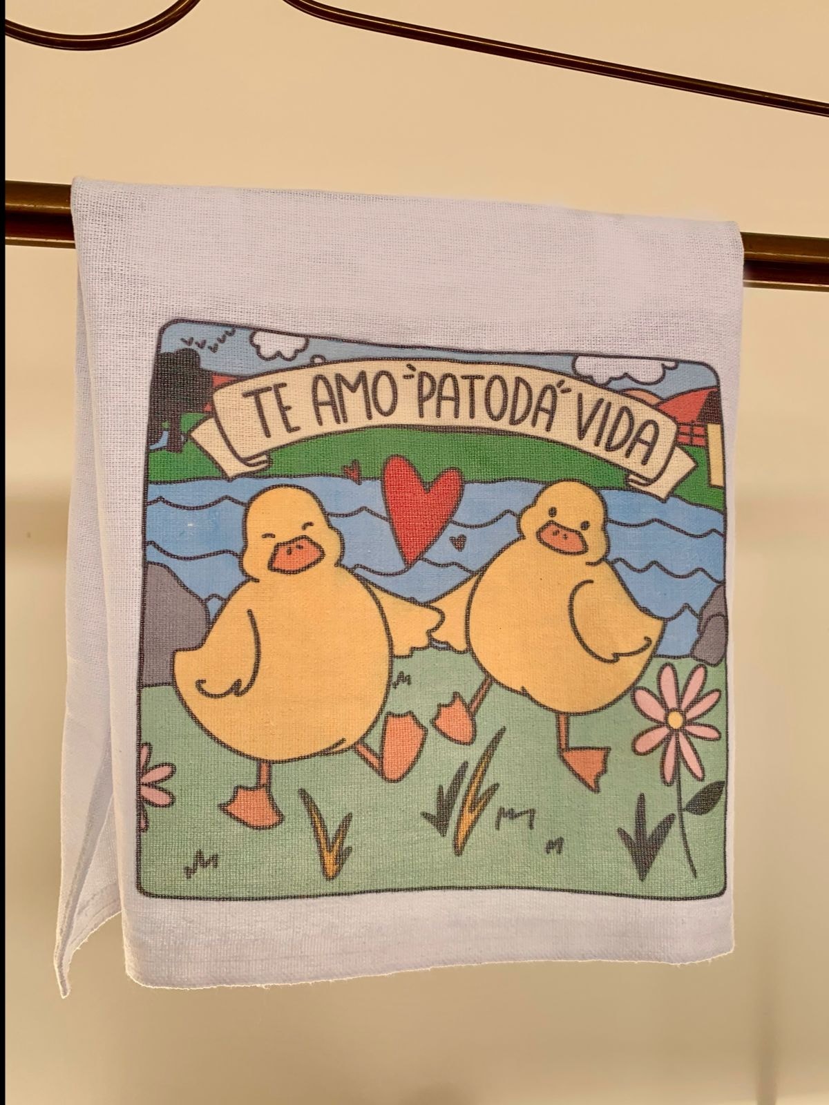 ‘Te Amo Patodavida’ é uma declaração de amor divertida. Fazer essa declaração através de um pano de prato é uma forma inesperada e singela de estar presente mesmo longe.
