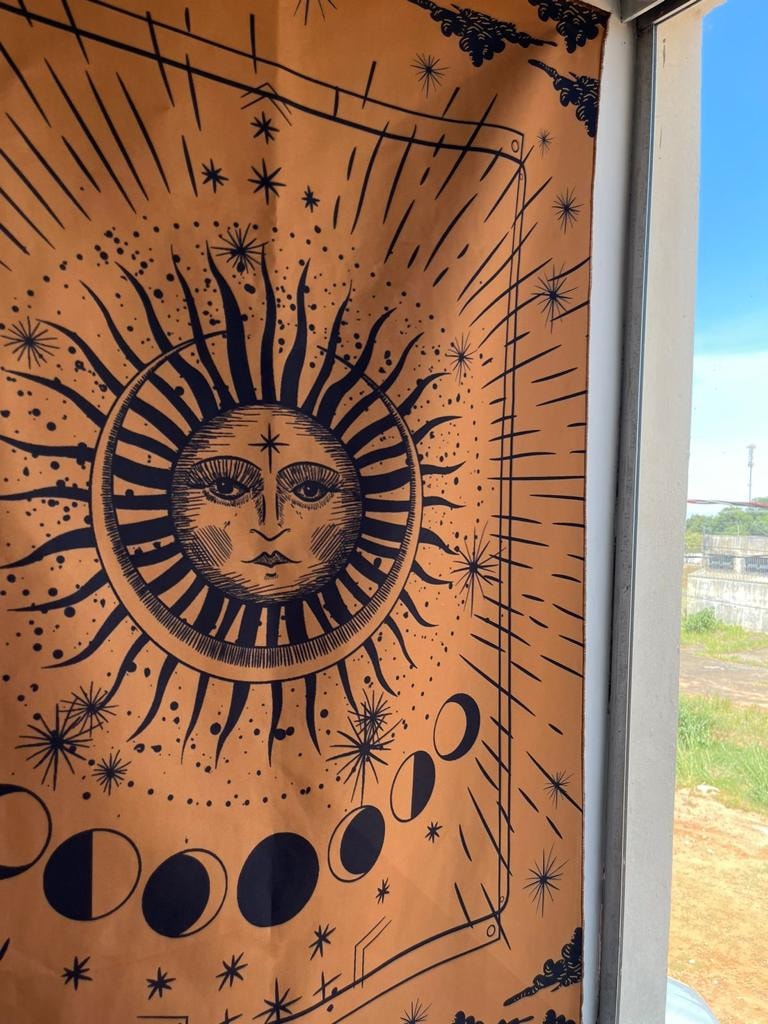 Símbolos escolhidos para a composição: Sol: Se conectar com as propriedades do sol é uma importante fonte de inspiração para que sejam construídas bases emocionais sólidas dentro de si. Sol é poder pessoal, vitalidade e racionalidade; Lua: Como tudo possui um oposto complementar, o panô Solar também representa a lua. Demonstrando a importância do equilíbrio entre feminino e masculino, razão e emoção, luz e sombra. A lua fala sobre dar voz à nossa intuição.