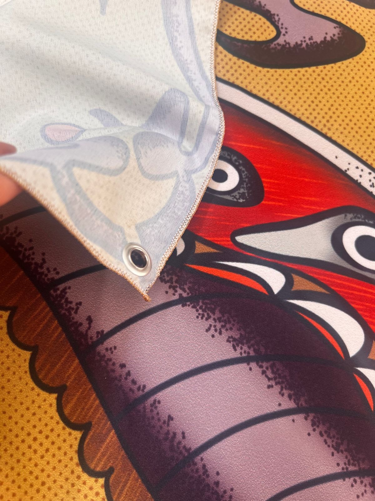 * Possui ilhós (círculo de metal para pendurar).