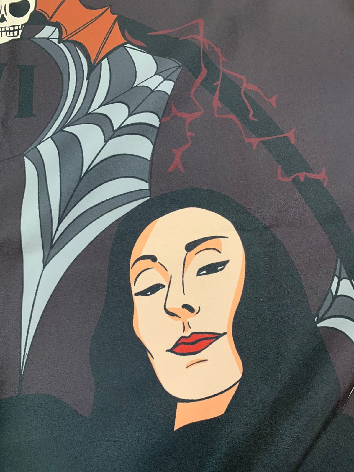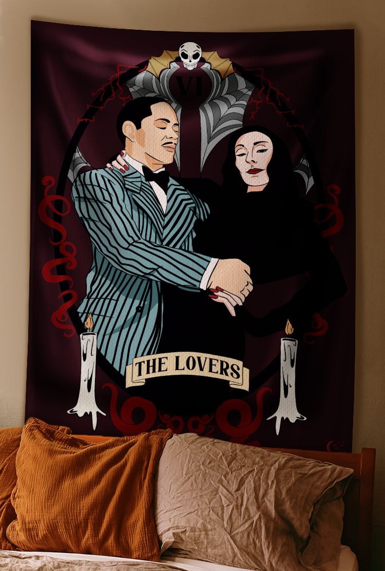Para simbolizar esse amor tão único, representamos Mortícia e Gomez a partir da carta de tarot Os Amantes, que revela uma conexão bela e profunda.
