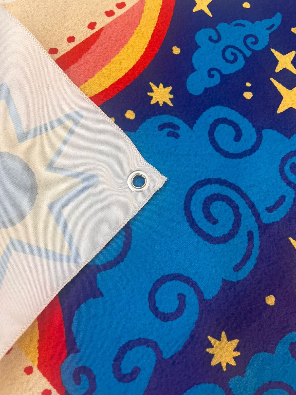 * Possui ilhós (círculo de metal para pendurar).