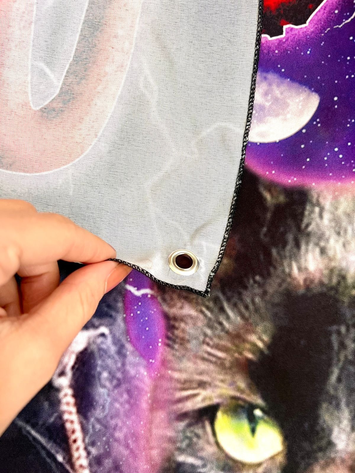 * Possui ilhós (círculo de metal para pendurar).