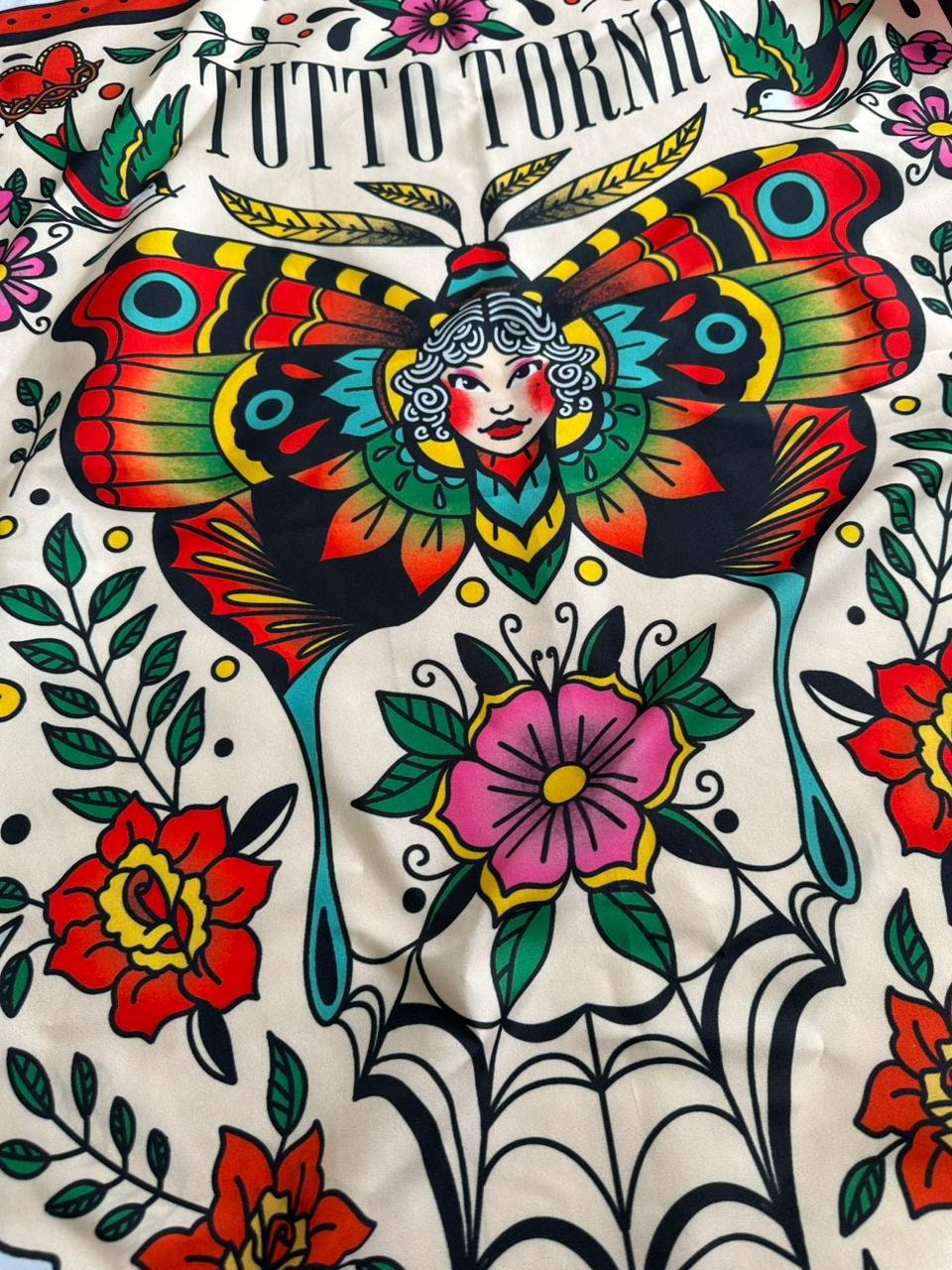 O panô Tutto Torna é estampado com traços Old School, considerado o primeiro estilo de tatuagem. Possui uma identidade marcante que remete à força e rebeldia.