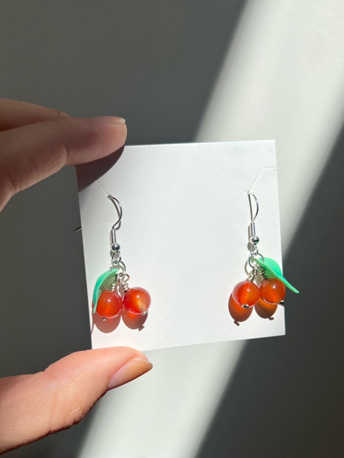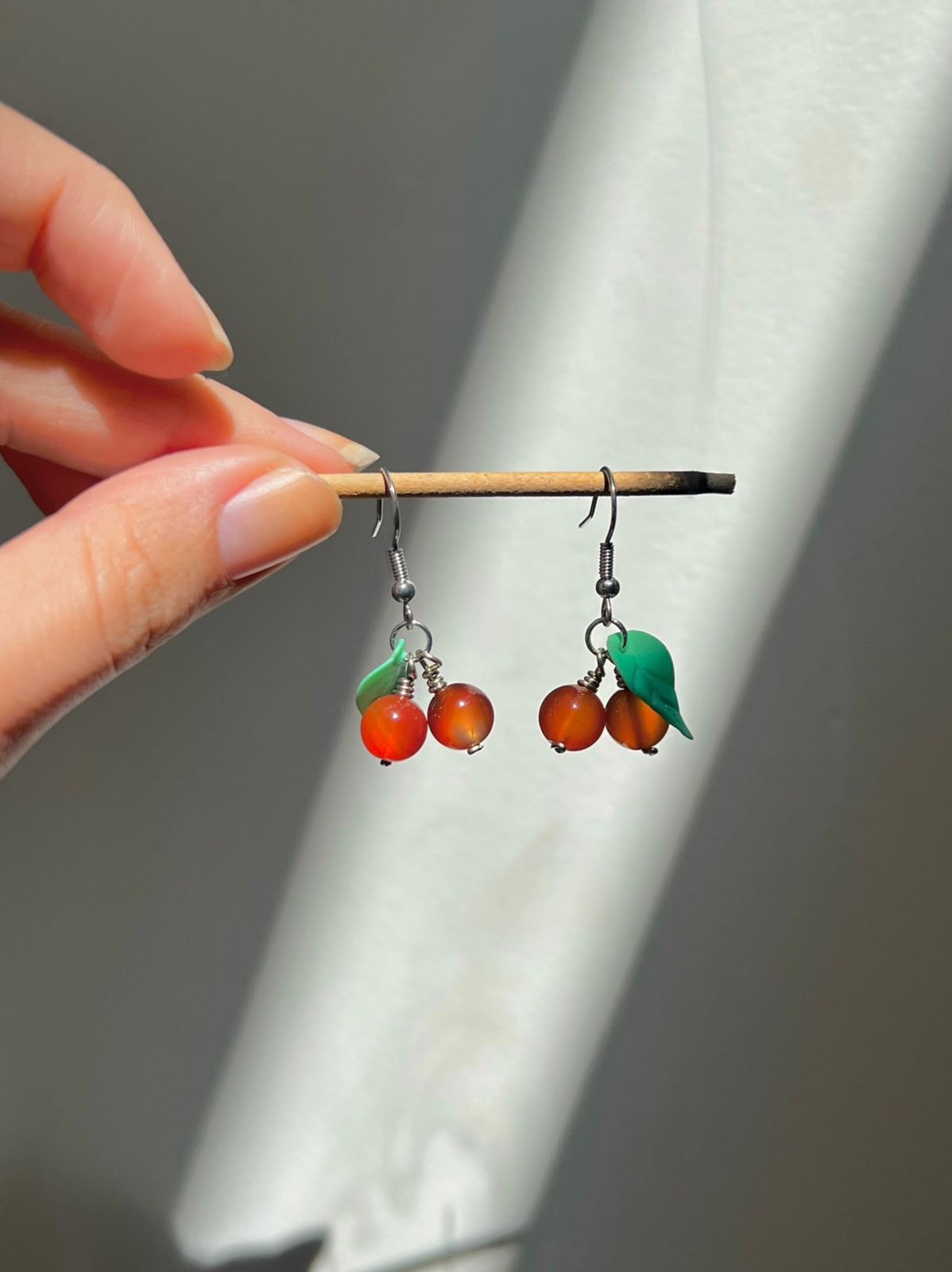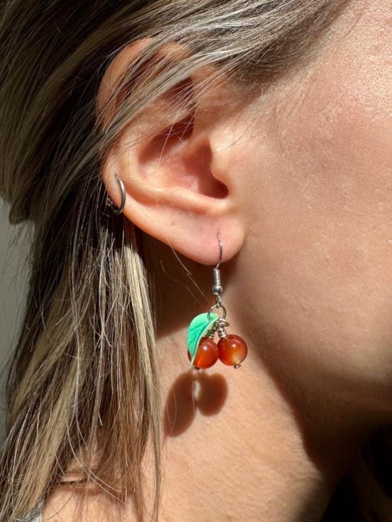 Brinco artesanal Cereja com Ágata de Fogo e folha feita à mão.
