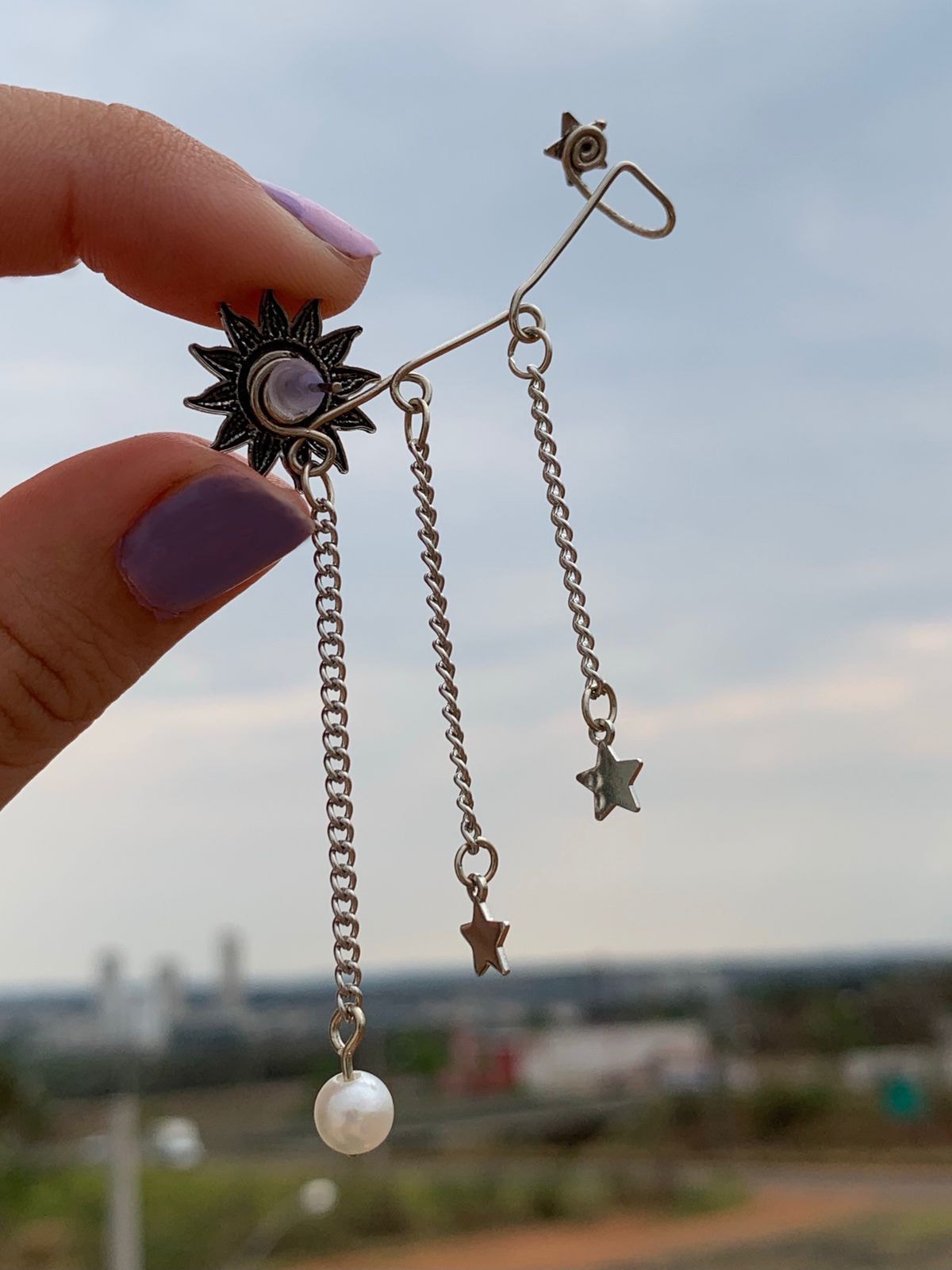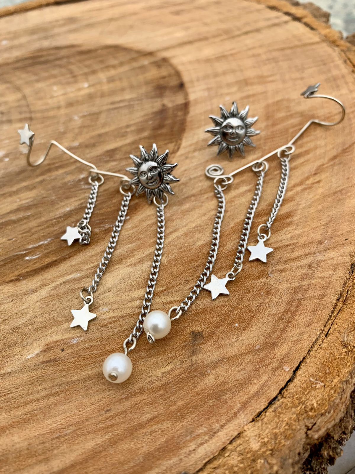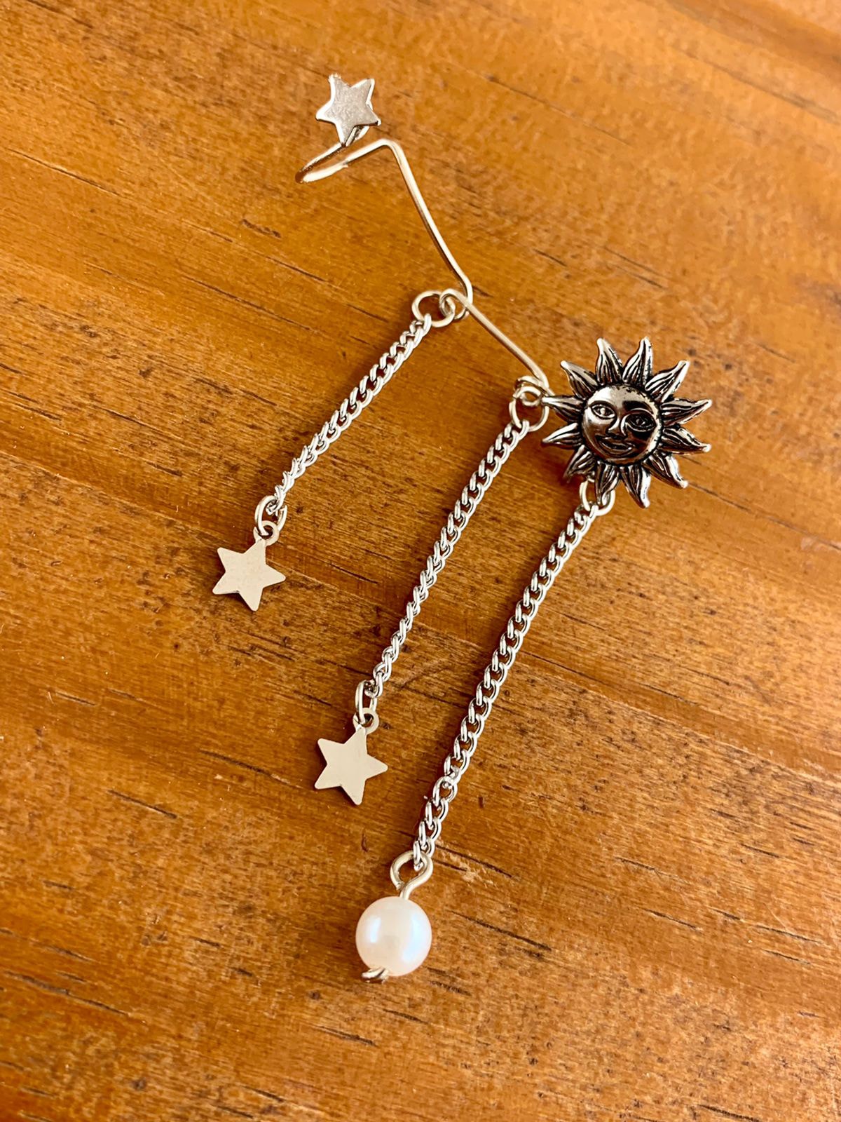 Brinco ear cuff artesanal com pingentes Sol e Estrela.