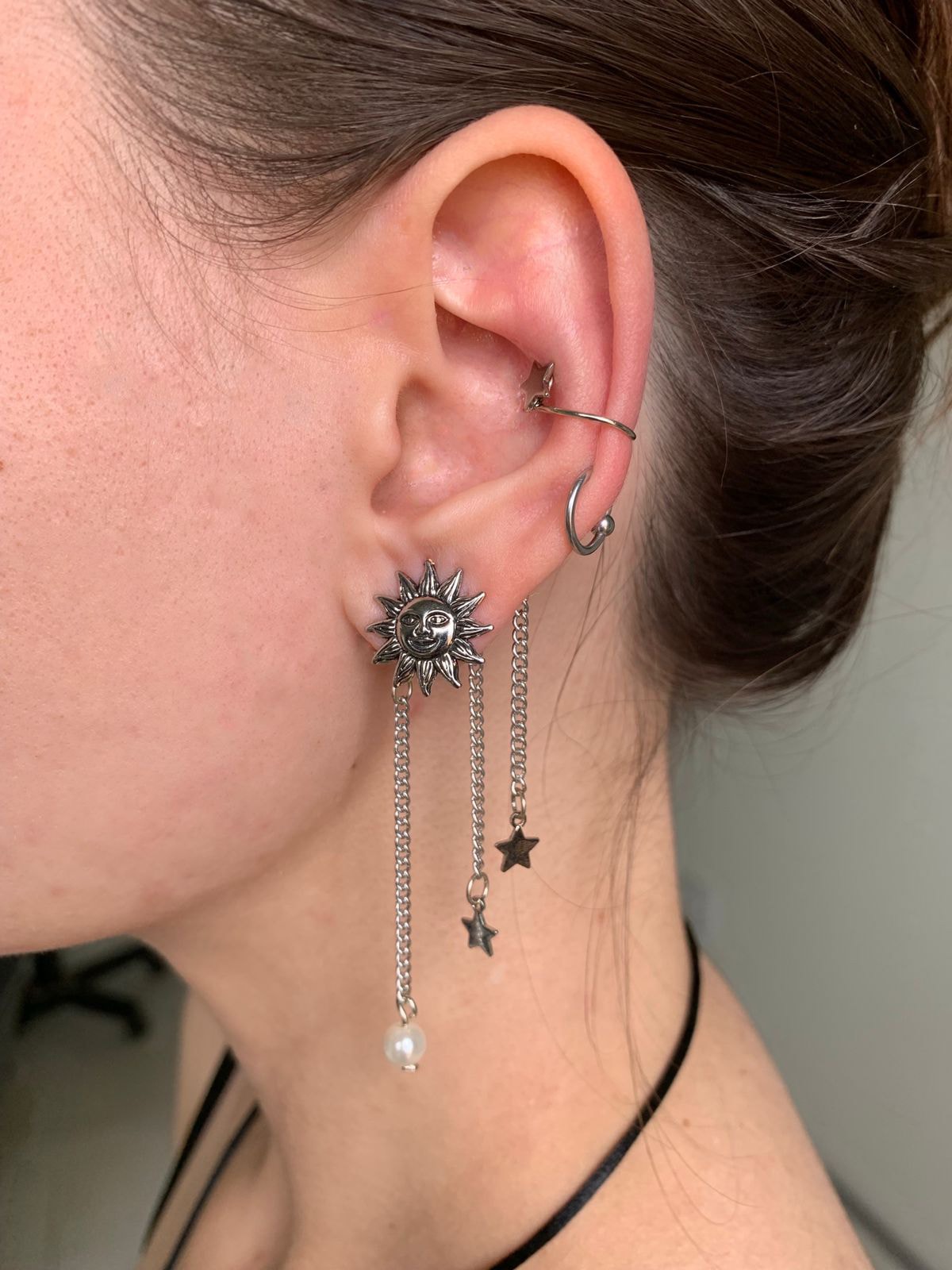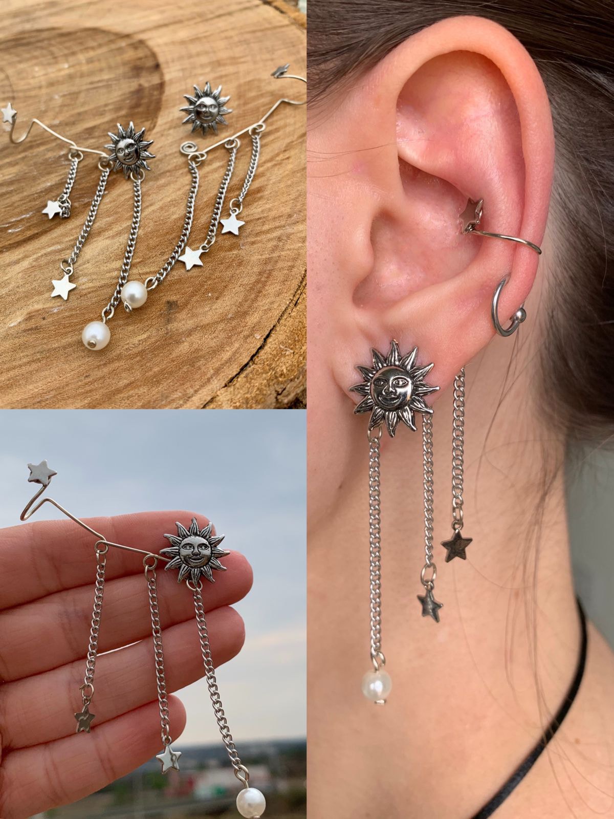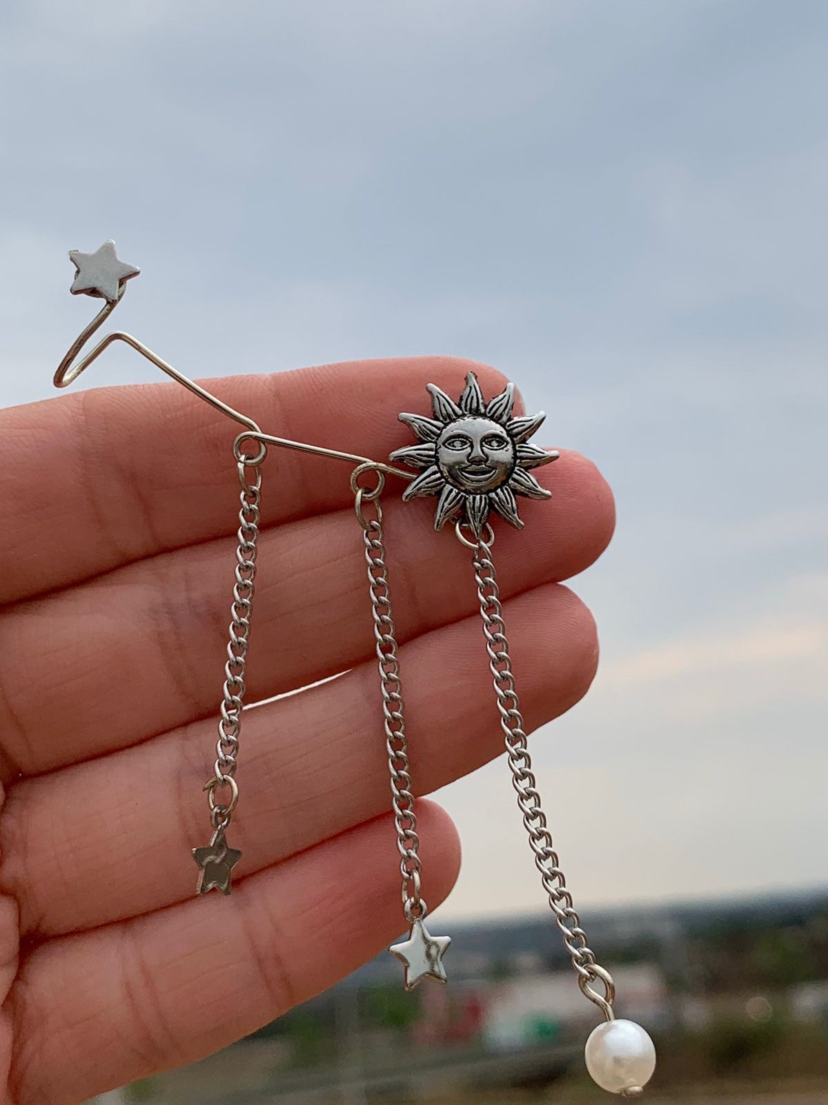 Brinco ear cuff artesanal com pingentes Sol e Estrela.
