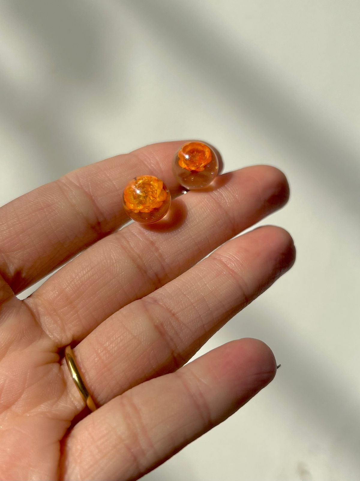Par de brincos em resina com flor natural, feito artesanalmente. Tamanho da esfera: 1 cm diâmetro.