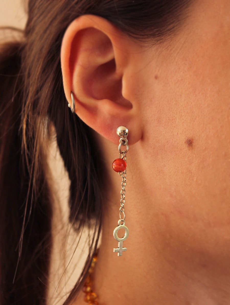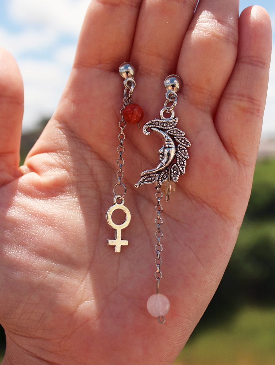 Brinco artesanal Lua e Espelho de Vênus com Quartzo Rosa, Cristal e Ágata de Fogo.
