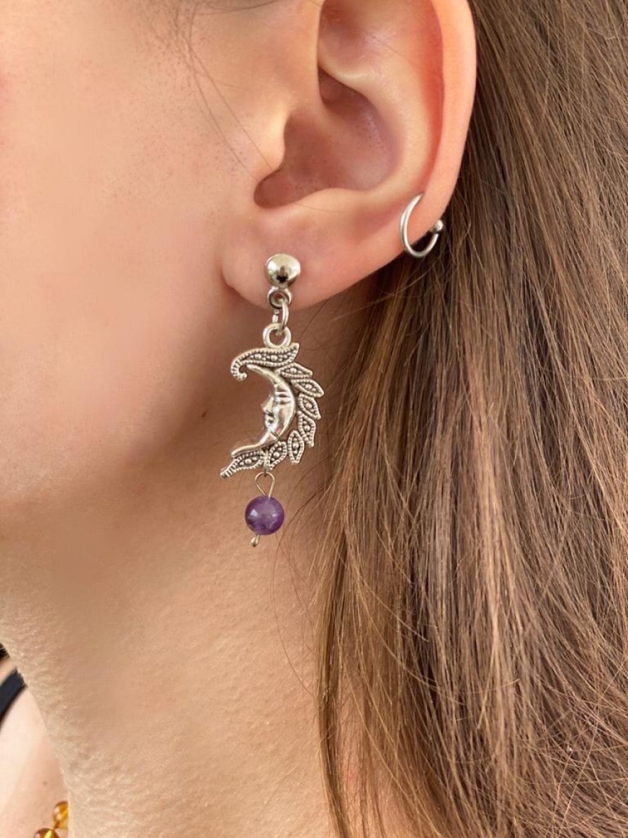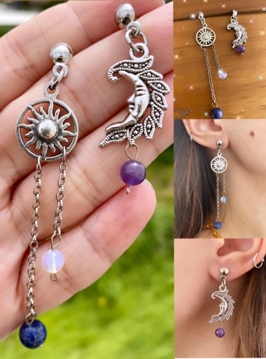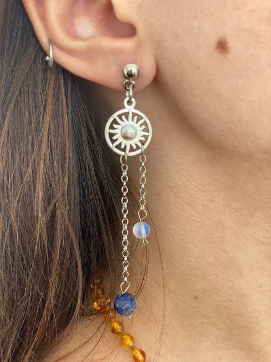 - 1 brinco com pingente Lua e pedra Ametista (4cm x 2cm) - 1 brinco com pingente Sol e pedras Opalina e Sodalita (9cm x 1,5cm)