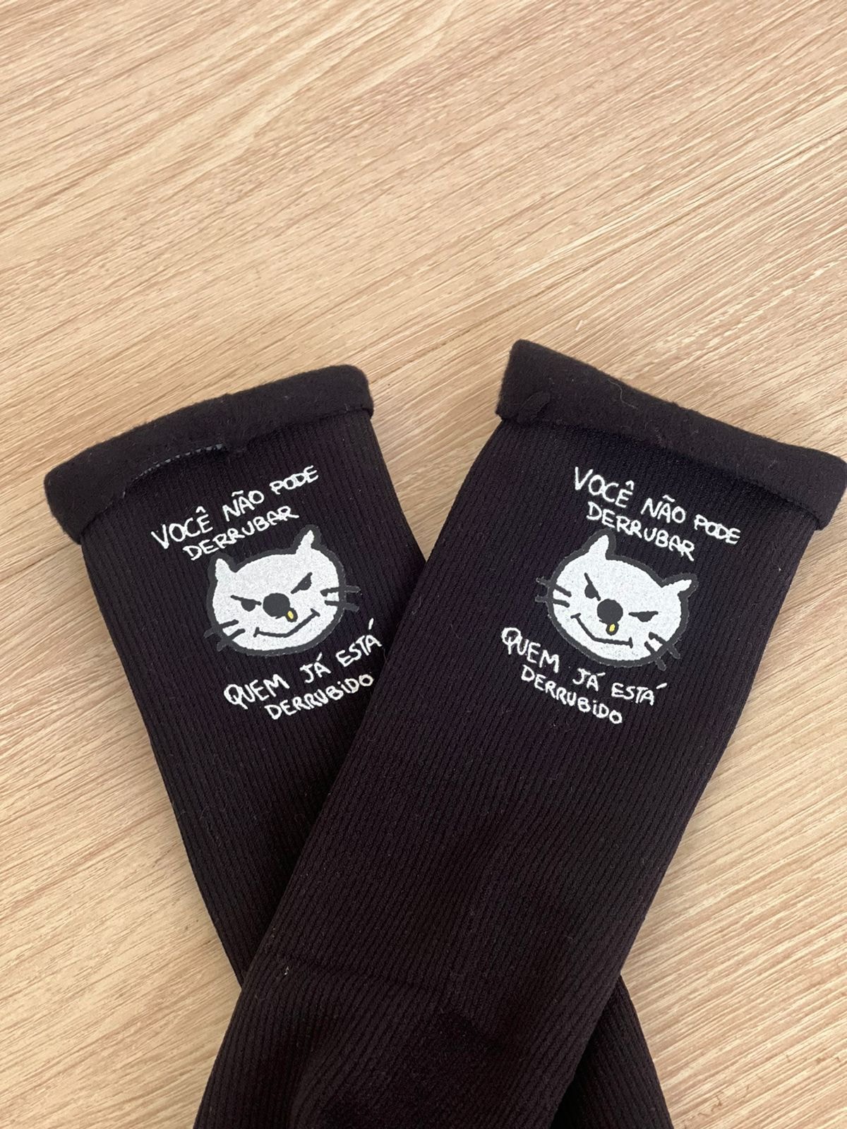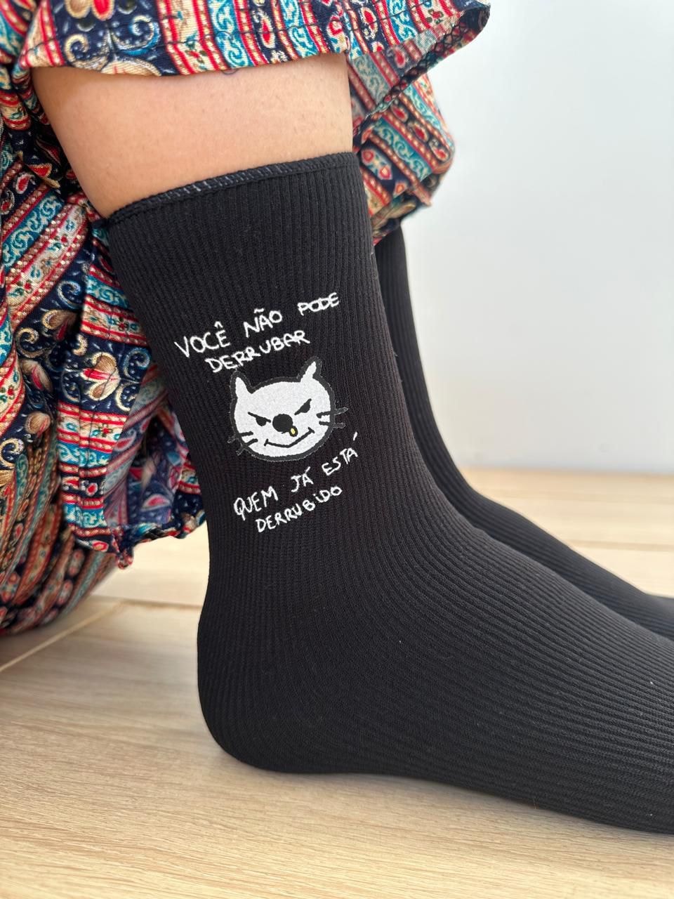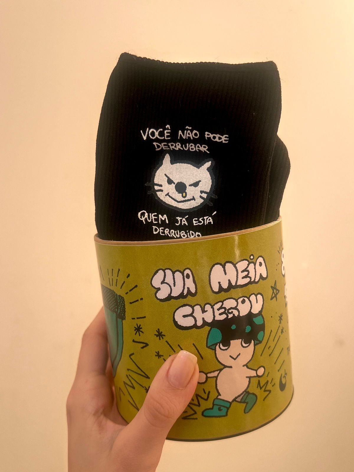 A meia tem costura que possibilita usar a estampa tanto na parte externa quanto na parte interna na perna.