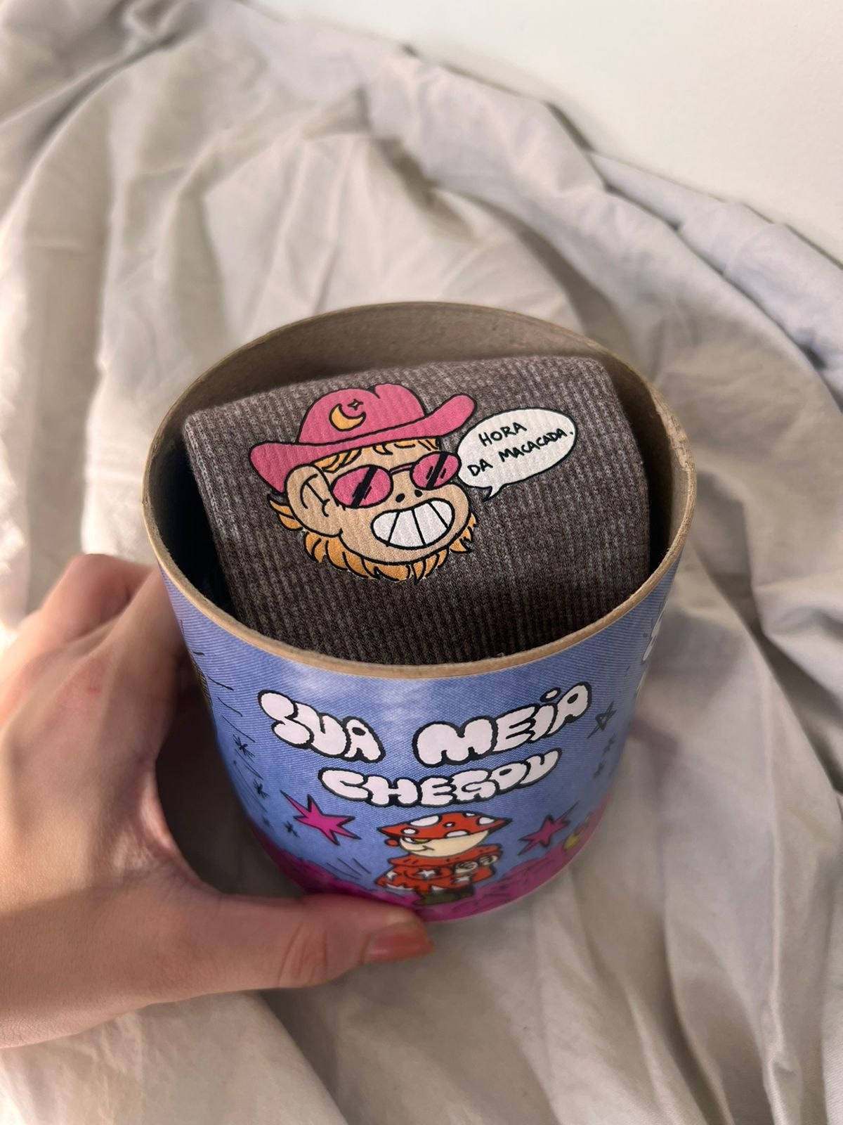 A meia tem costura que possibilita usar a estampa tanto na parte externa quanto na parte interna na perna.