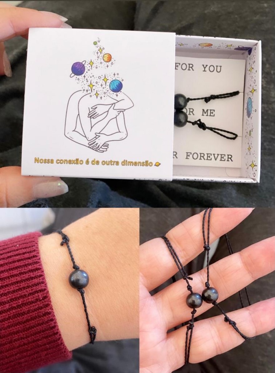 O par de pulseiras Conexão é uma forma bonita de desejar proteção e estimular a outra pessoa a descobrir e usar sua força. As pedras são magnéticas e representam uma ligação poderosa entre duas pessoas.