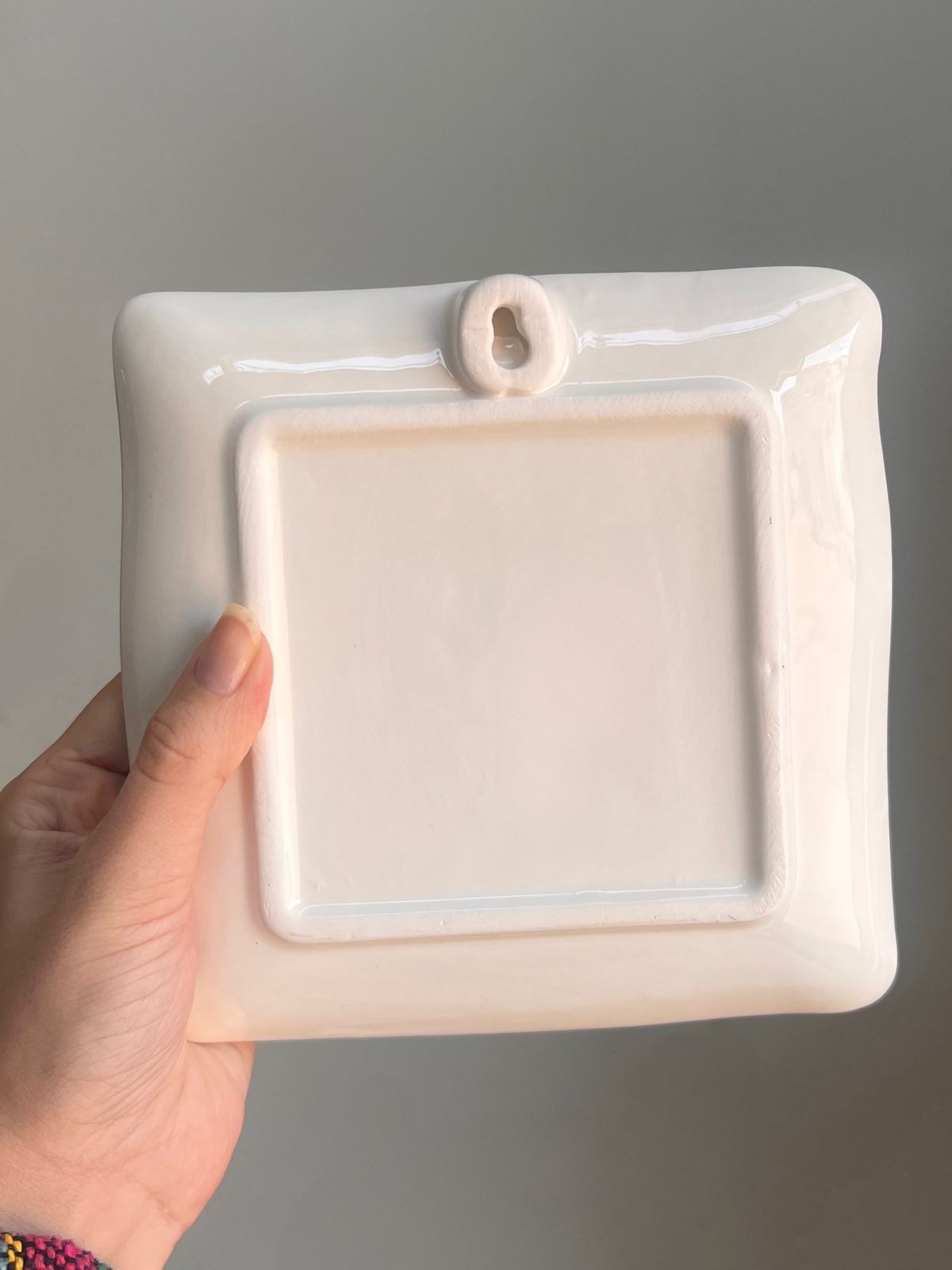 Cerâmica esmaltada com desenhos em relevo. Pode ser usada como prato, quadro ou porta joias. Mede 16cm de diâmetro.