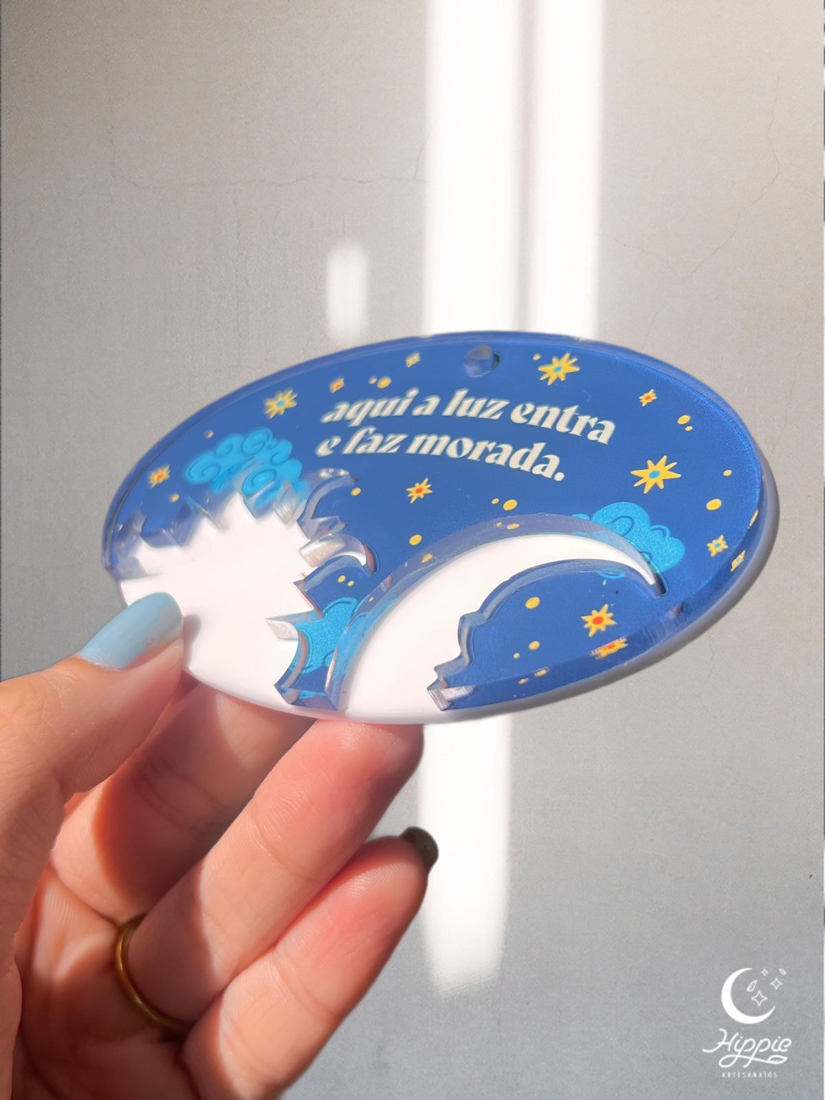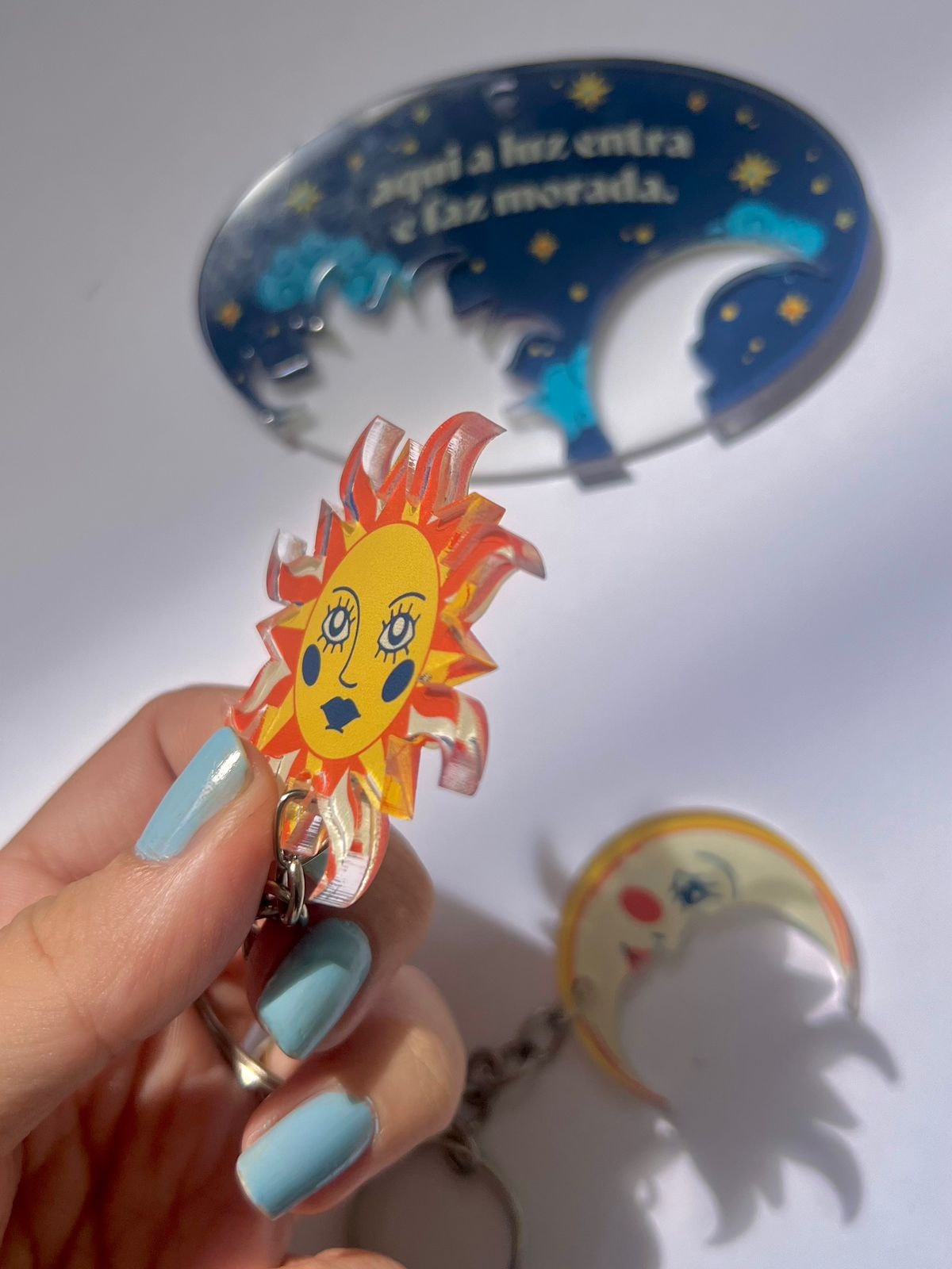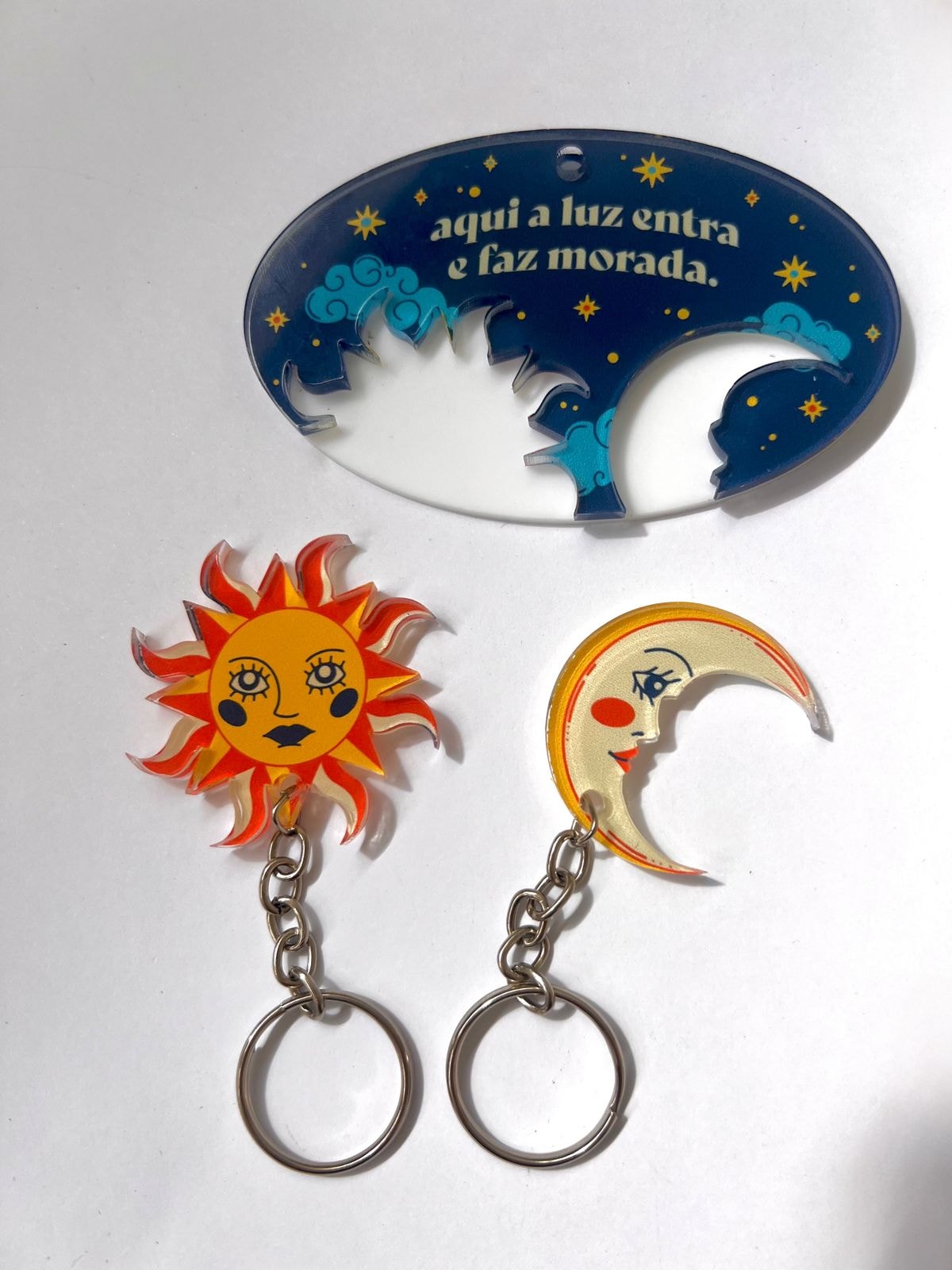 Medida: Porta-chaves com 10,5cm x 7cm. Chaveiro Sol com 5cm x 5cm. Chaveiro Lua com 4cm x 4cm.