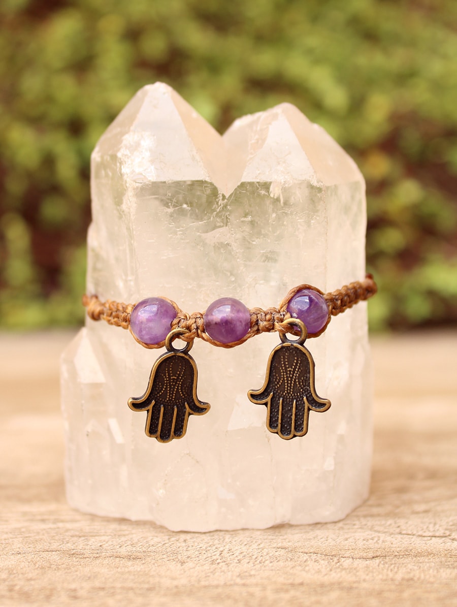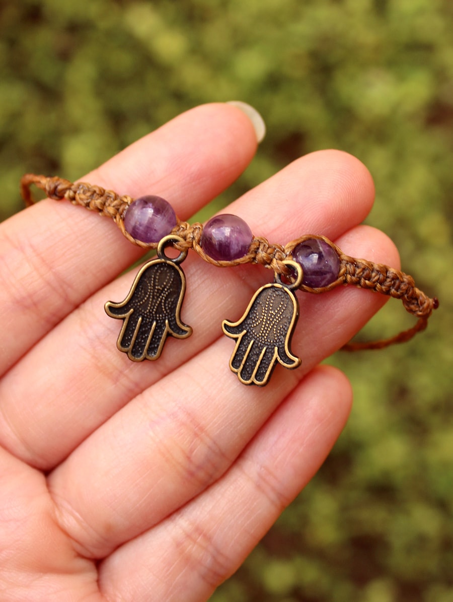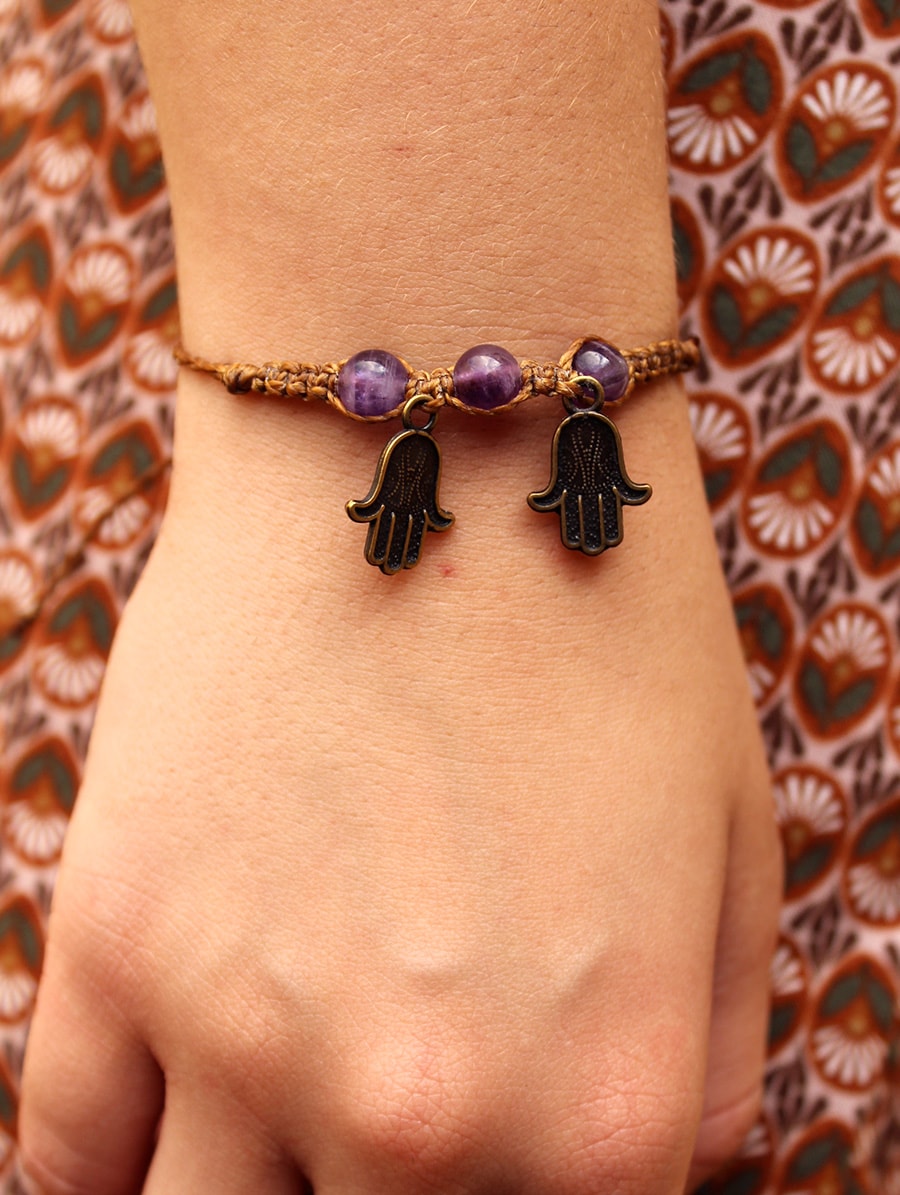 Pulseira artesanal Ametista Hamsá. Cordão trançado à mão em técnica macramê.