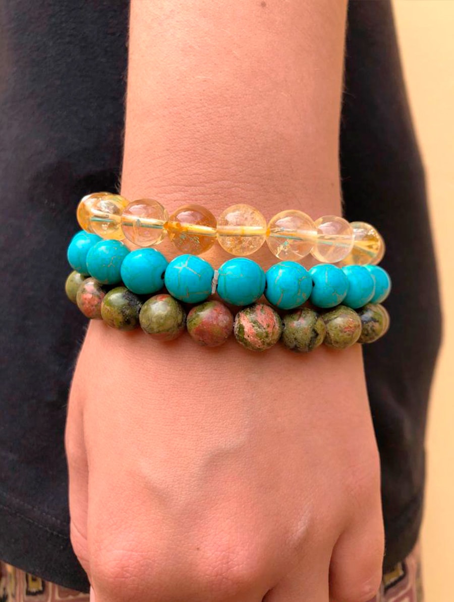 Citrino: O Citrino é uma pedra com forte poder de atração de prosperidade, auto-estima e sucesso profissional. Faz isso atuando no fortalecimento da autoconfiança. Ainda, atrai a capacidade de ganhar dinheiro. Turquesa: Além de possuir uma beleza incrível, essa pedra tem a capacidade de relaxar todo o sistema nervoso, acalmar a mente e auxilia a verbalizar os pensamentos. Unakita: A pedra Unakita é linda e poderosa. Sua energia abre caminhos para o renascimento espiritual. Possui uma vibração com o poder de trazer luz e ajudar a rever questões do passado, auxiliando a relacioná-las a bloqueios atuais.