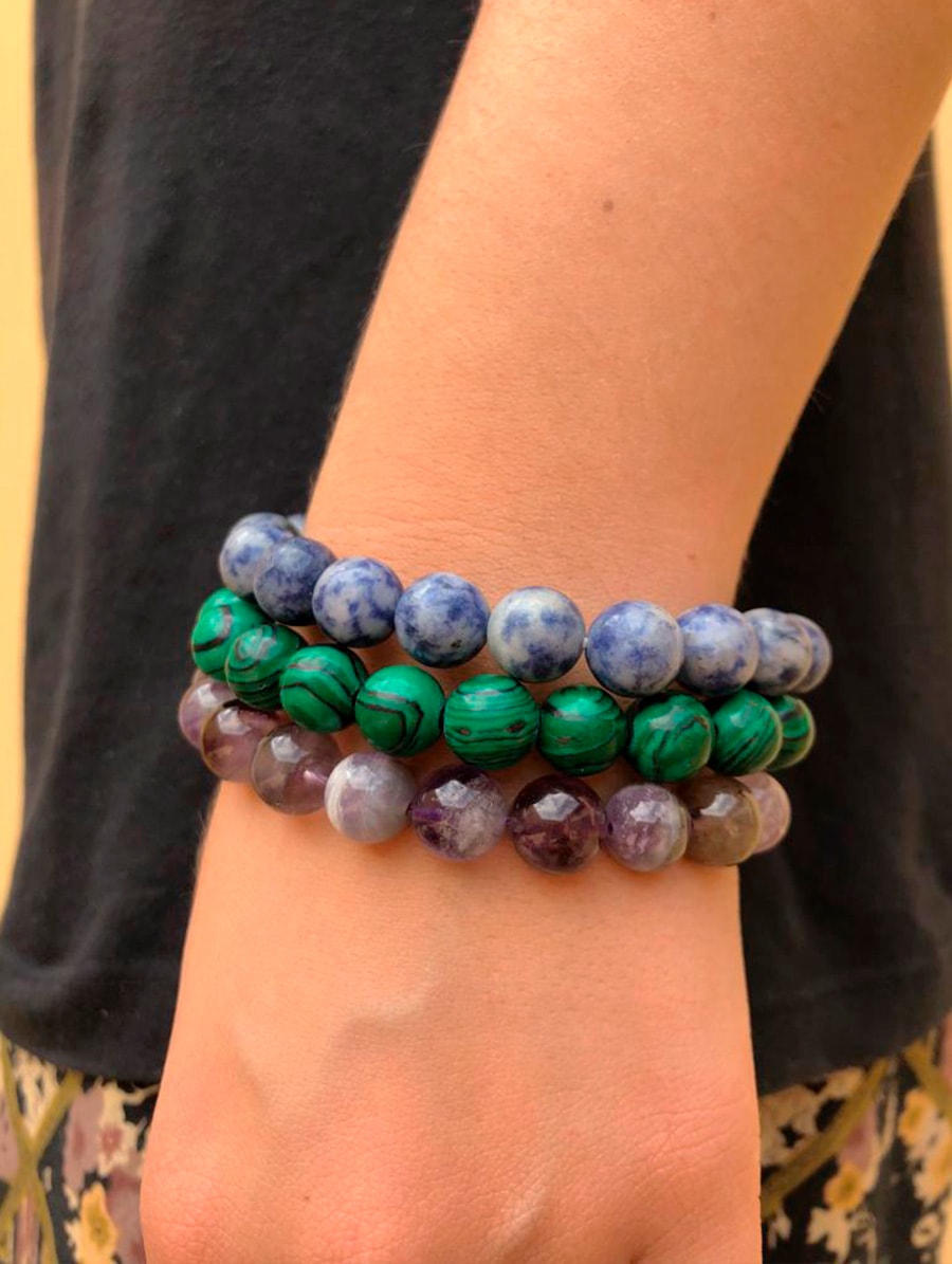 Ametista: A pedra Ametista é conhecida por suas propriedades calmantes. Sua cor violeta é considerada a cor da magia e do misticismo. Por isso, é tida como a pedra da sabedoria. Malaquita: A Malaquita é conhecida como a pedra da Beleza e do Amor. O verde profundo e curativo da malaquita representa as ervas, as flores, as árvores e as raízes. Sodalita: Sodalita é a pedra da intuição e do direcionamento. Auxilia a acalmar a mente e a aumentar a intuição. A Sodalita facilita o processo de ouvir e conhecer a nós mesmos profundamente.