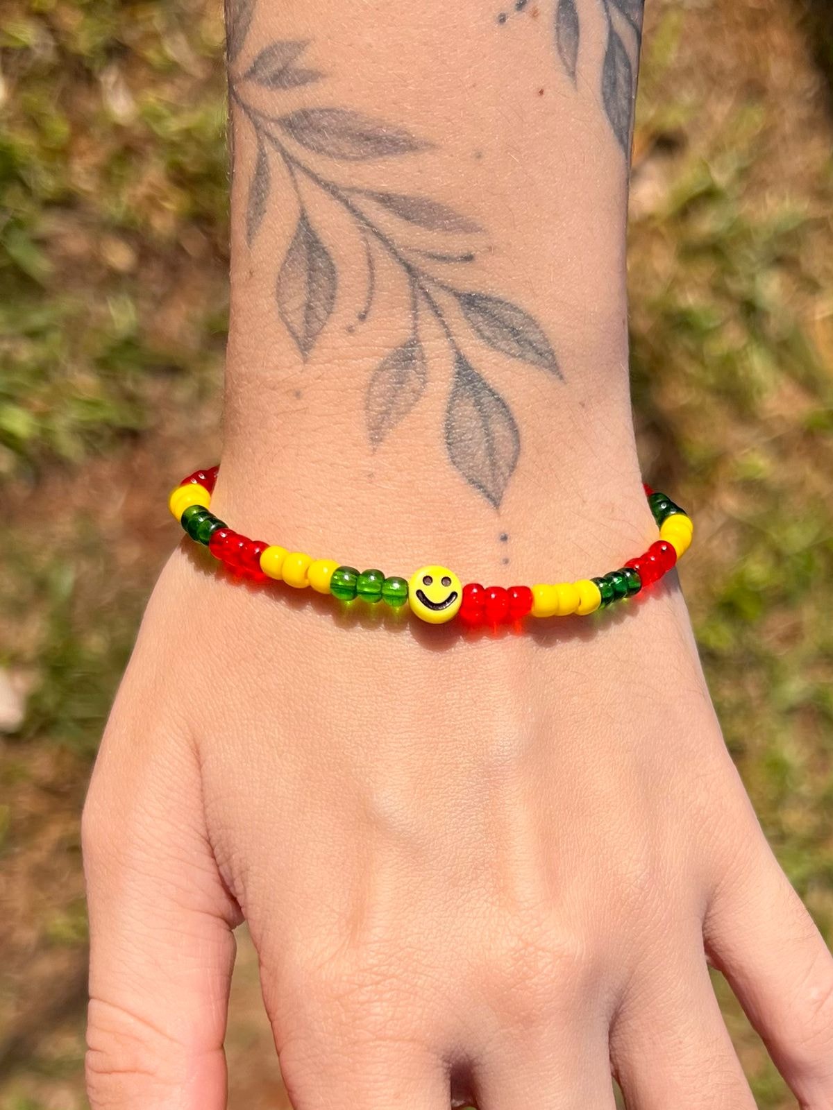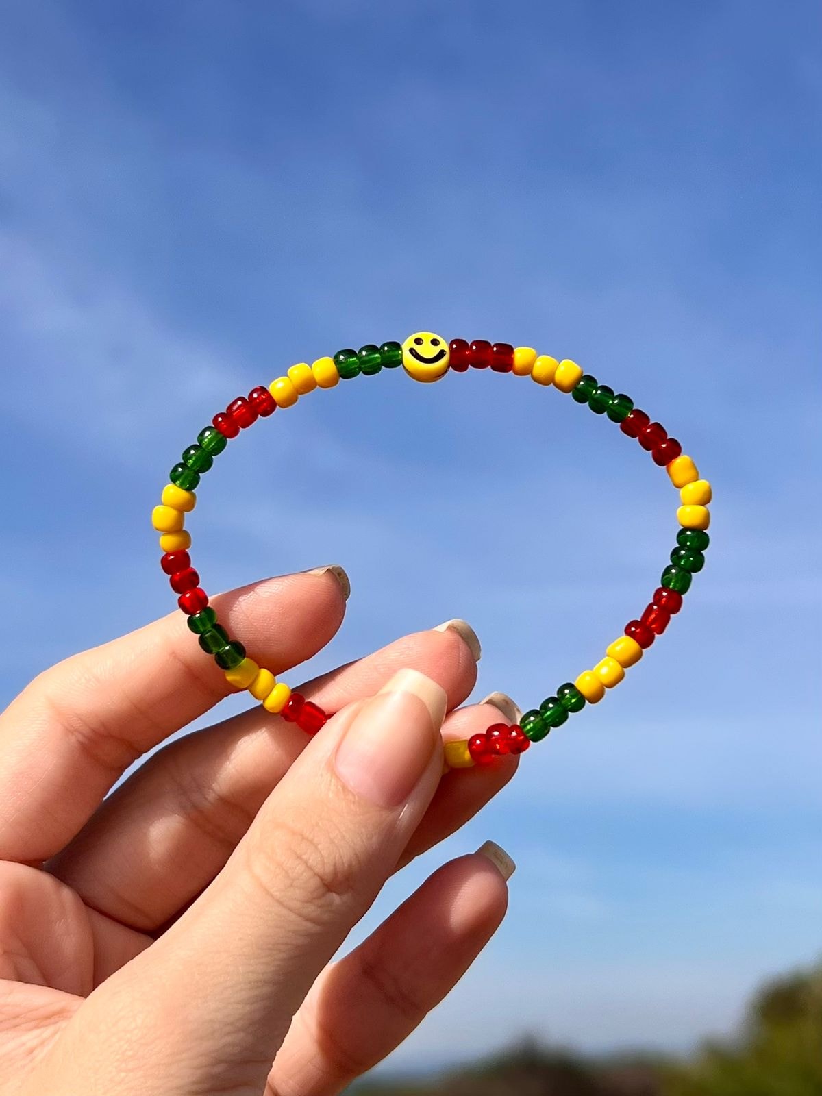 Pulseira de elástico. Com cores vermelhas, verdes e amarelas.