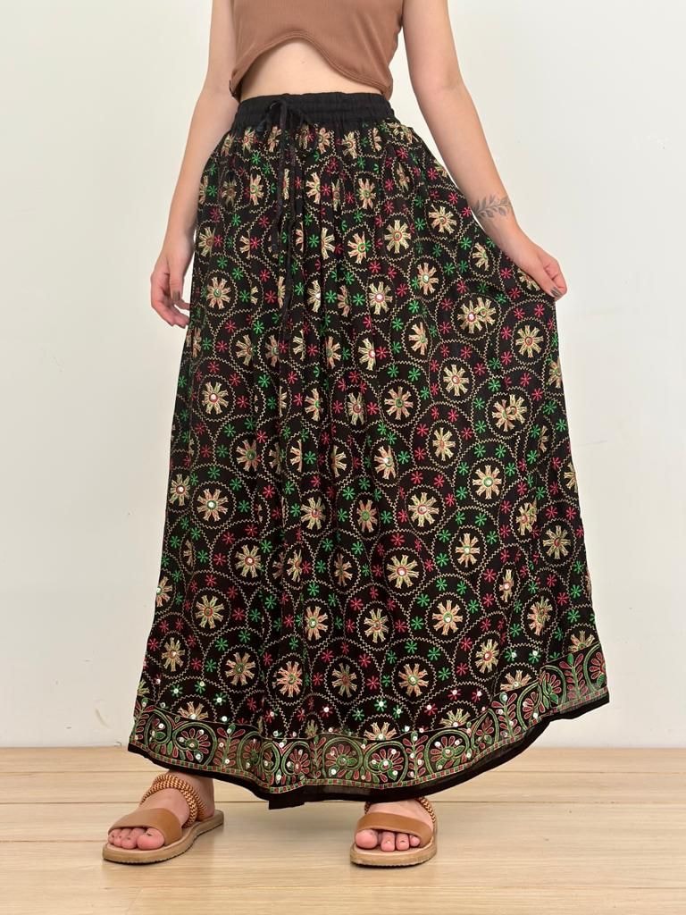 Saia longa Indiana com elástico na cintura e cordão ajustável.