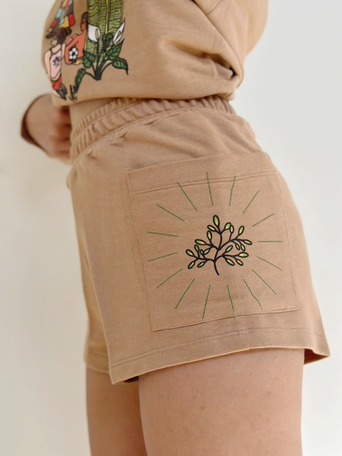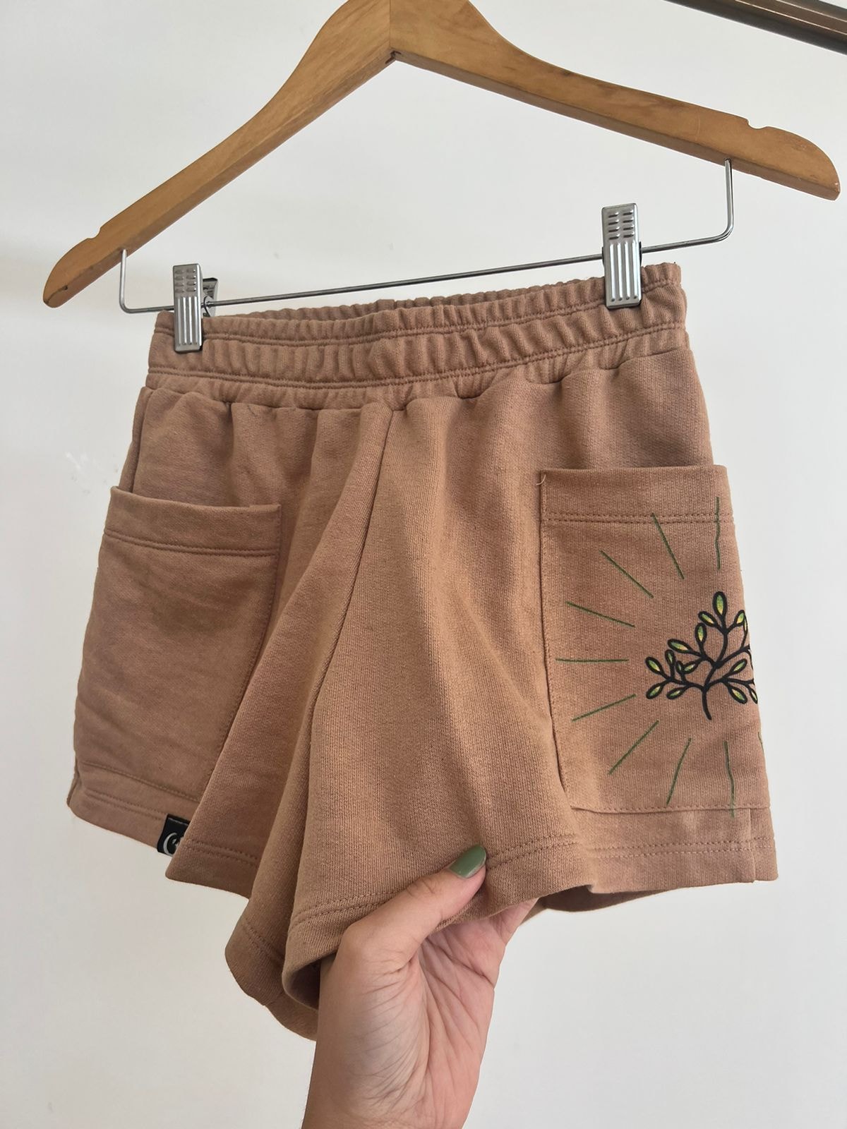 Possui 2 bolsos quadrados nas laterais e elástico na cintura.
