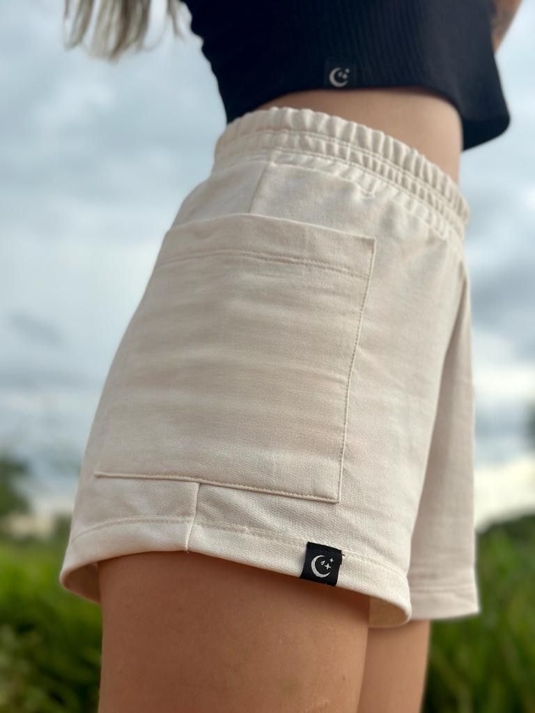 Possui 2 bolsos quadrados nas laterais e elástico na cintura.
