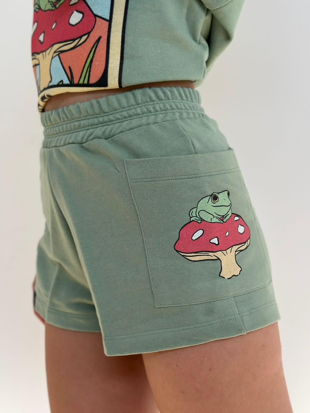Possui 2 bolsos quadrados nas laterais e elástico na cintura.