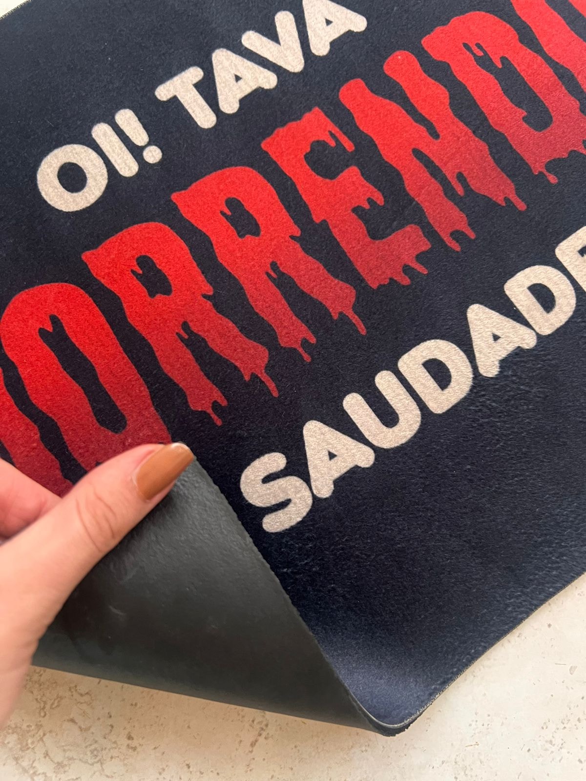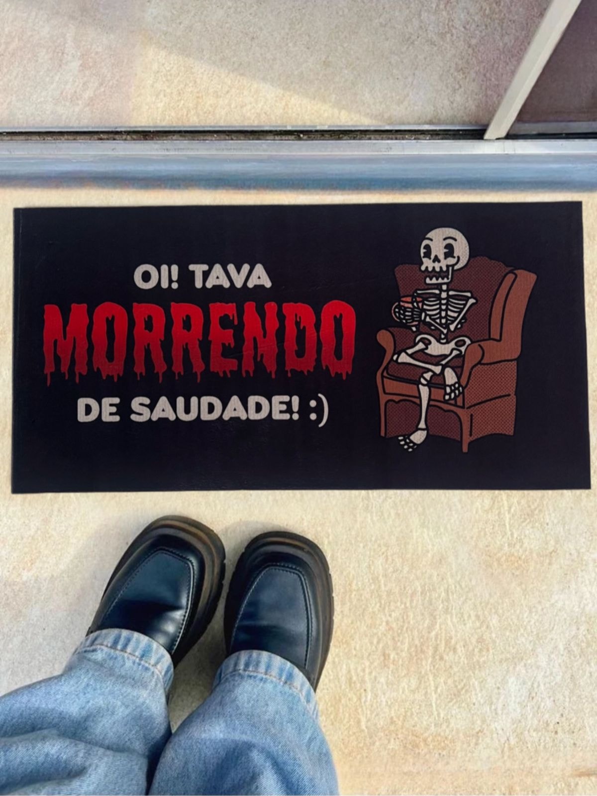 No tapete Caveira com Saudade, o esqueleto está ali, só esperando o chá e a companhia... ‘Oi! Tava morrendo de saudade!’ – porque até os mortos sabem que a saudade não tem limites!