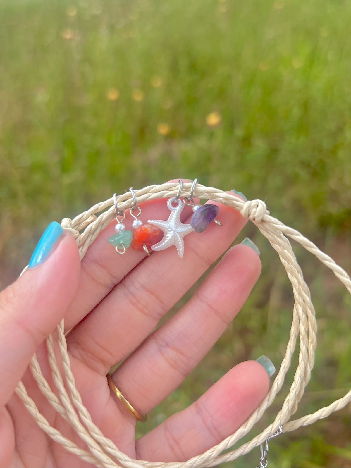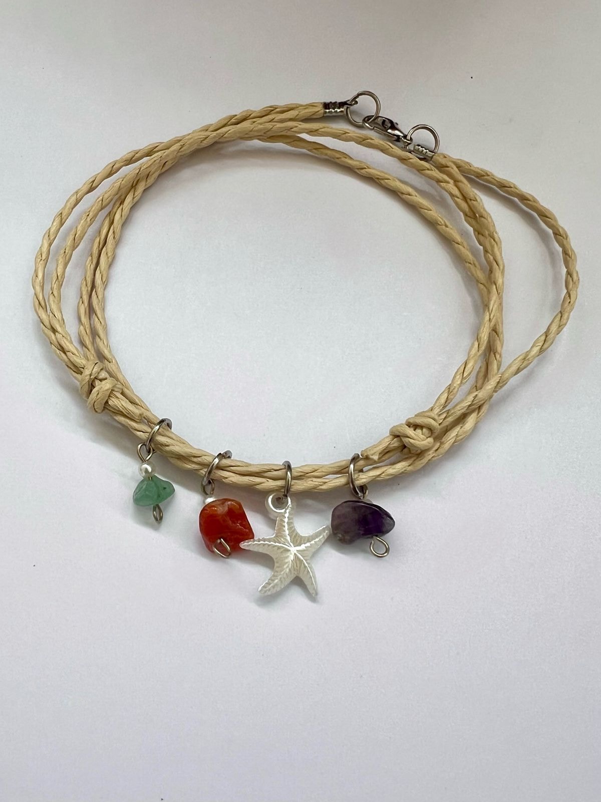 Material: Cordão de palha, estrela do mar de resina e cascalhos de cristais naturais. Medida: Ajustável.