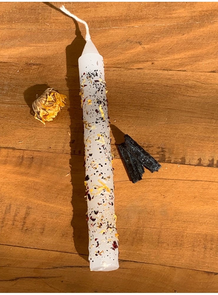 Essa é uma vela de proteção. Possui elementos que afastam energia negativa e limpam o ambiente, equilibrando as vibrações e assim abrindo o caminho para a prosperidade e positividade.