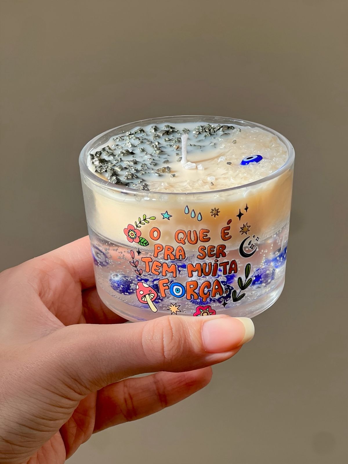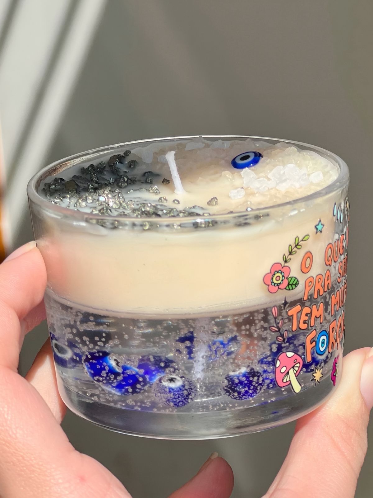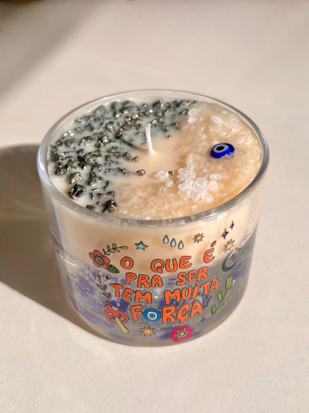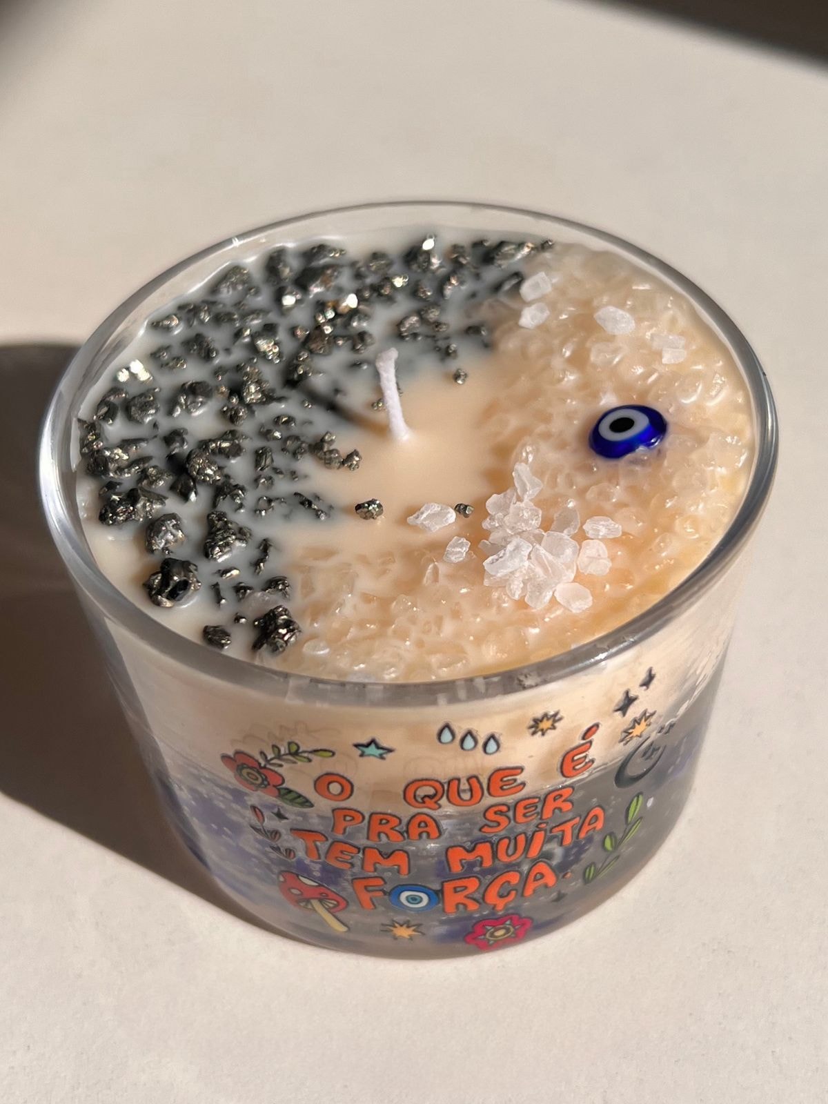 Composição: Sal Grosso, Pirita, Olho grego de murano, vela em gel e cera eco.