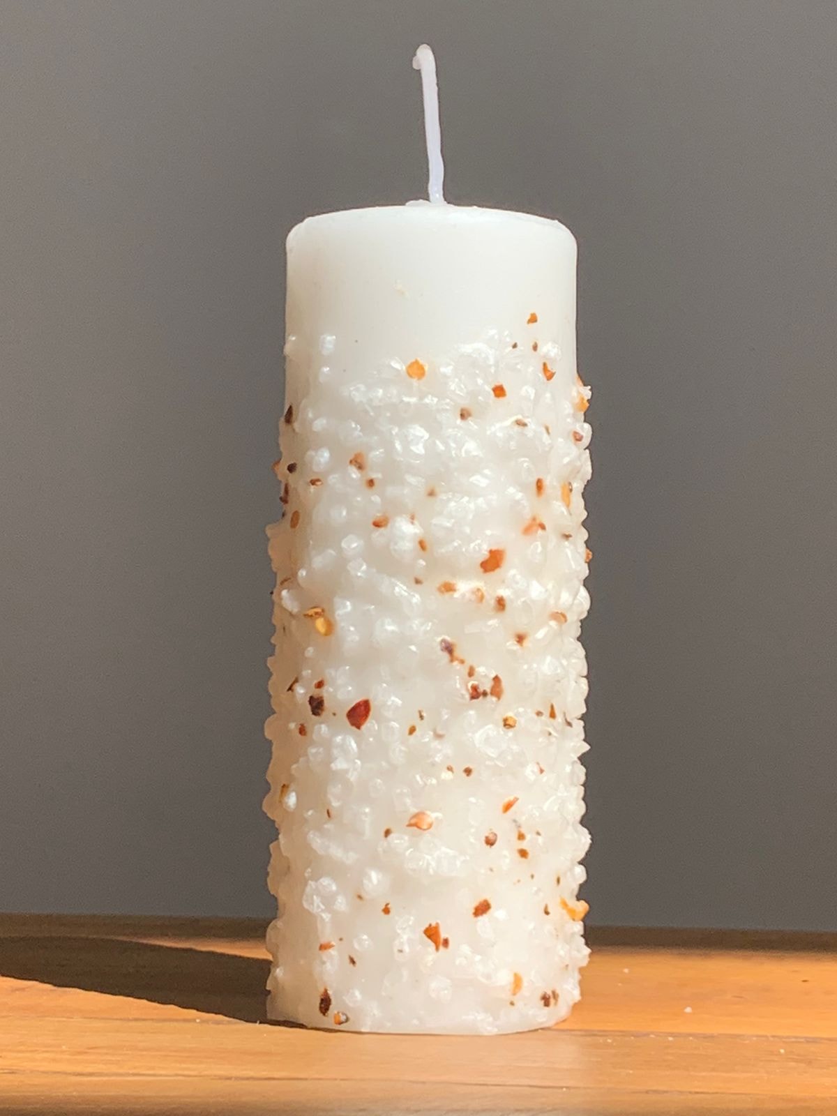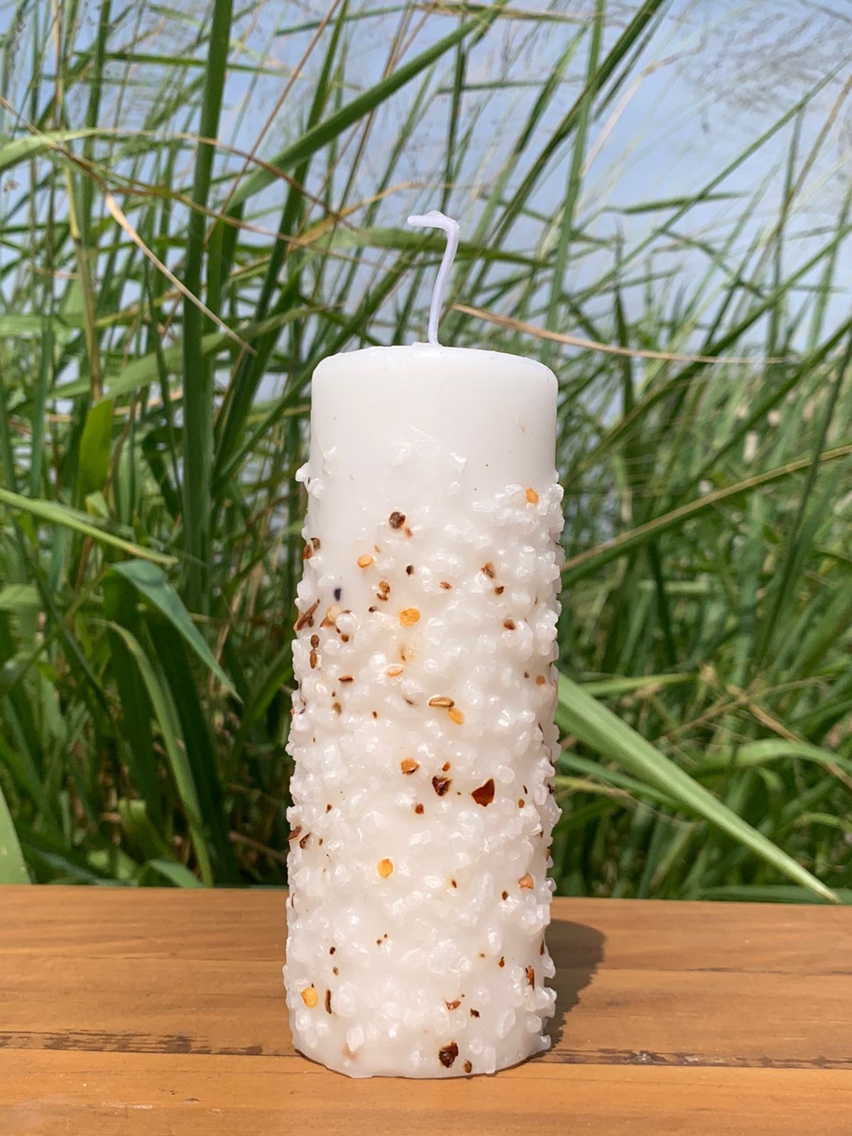 A Vela Sal Grosso com Pimentas é a combinação perfeita para limpeza energética. Quando você estiver sentindo a aura carregada, acenda esta vela e se concentre em bons pensamentos. Assim, toda a energia ruim que possa estar te rondando será purificada e os maus olhados serão tirados de cima de você.