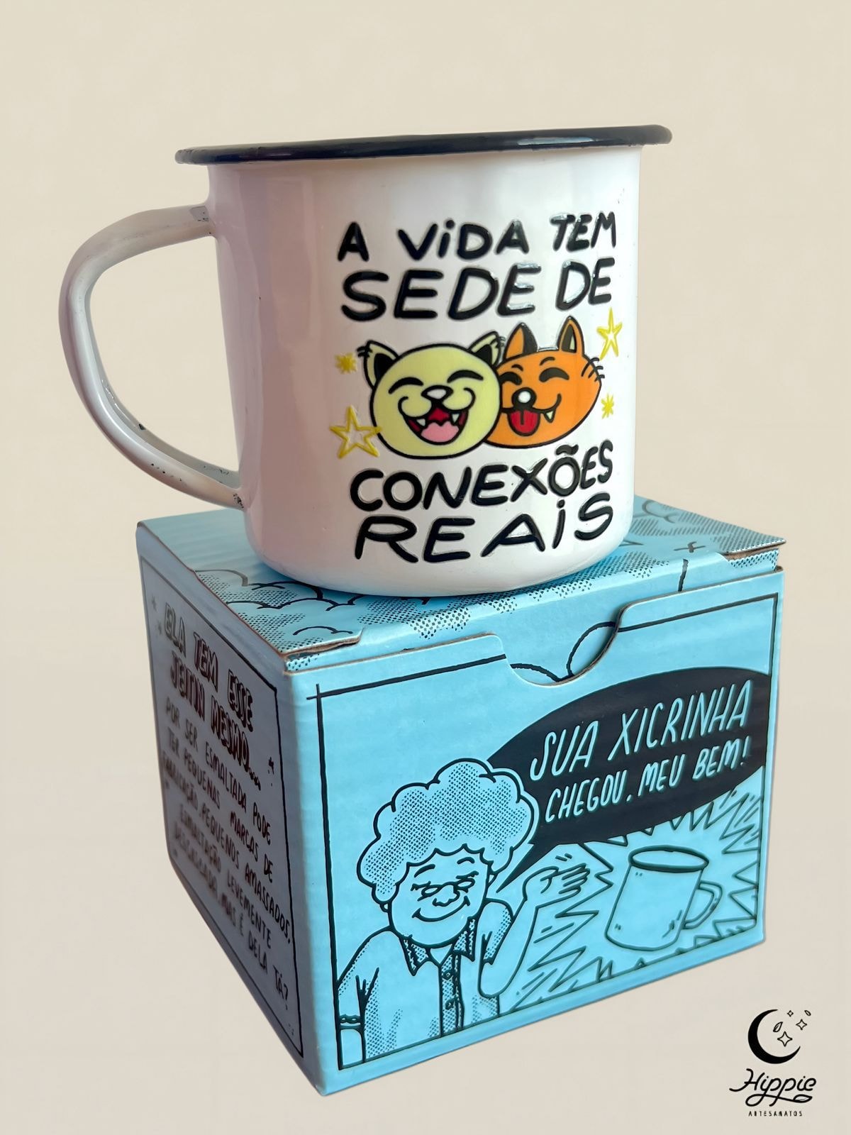 * Xícara de metal esmaltada, 150ml.